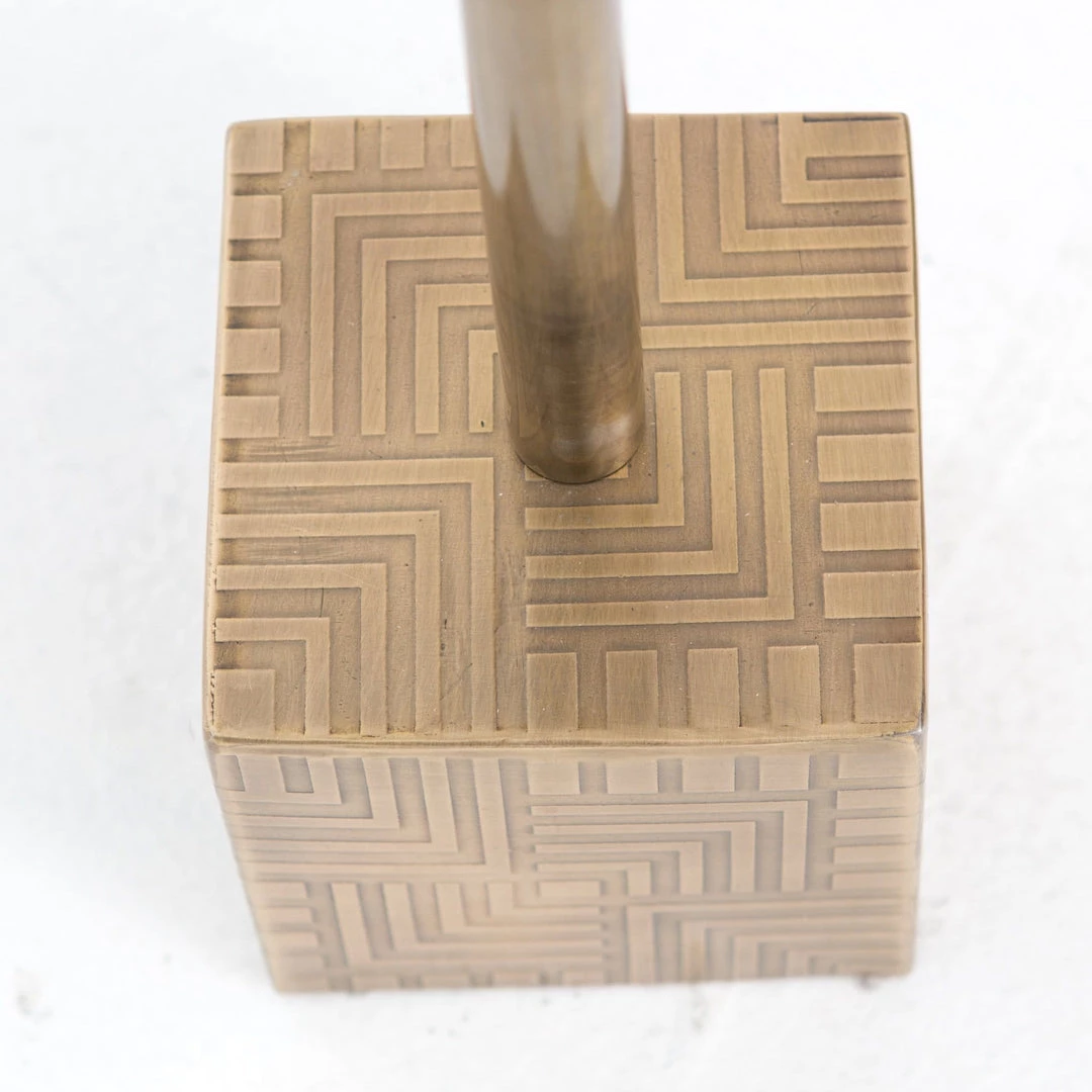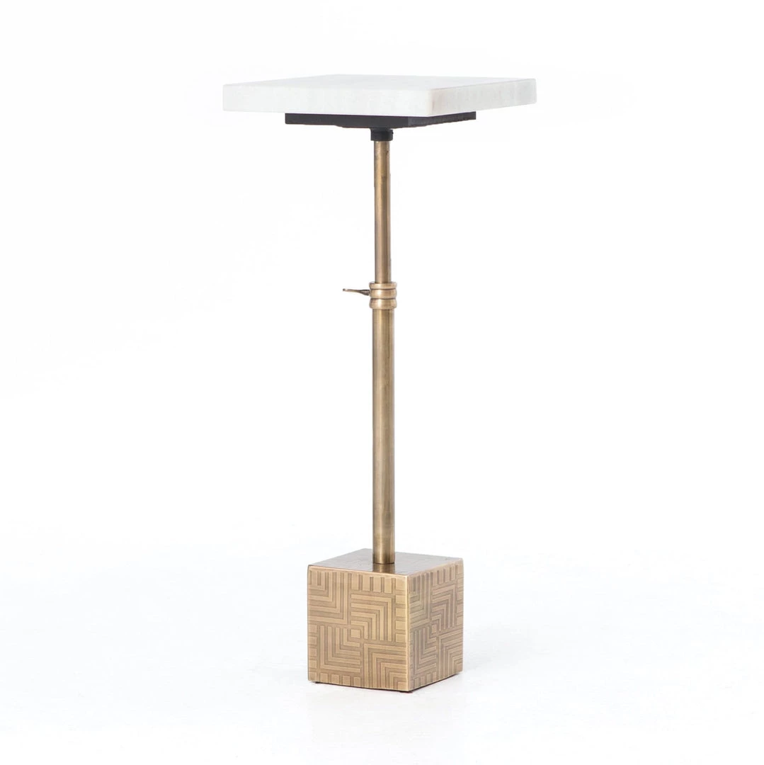 A heavy, acid-etched steel block anchors a telescoping base finished in antique brass and a gleaming white marble top. Adjust up or down to hold drinks beside a sofa, or as a pedestal for a treasured object. Unique marks and slight variations in the design may occur as part of the etching process.