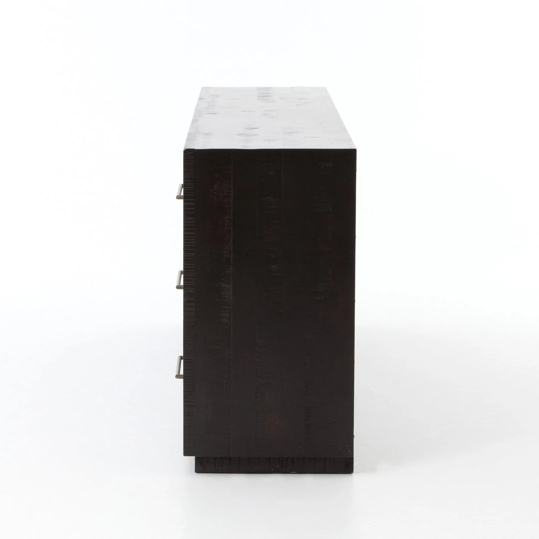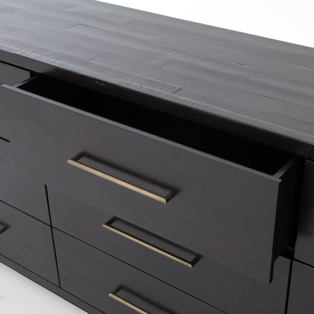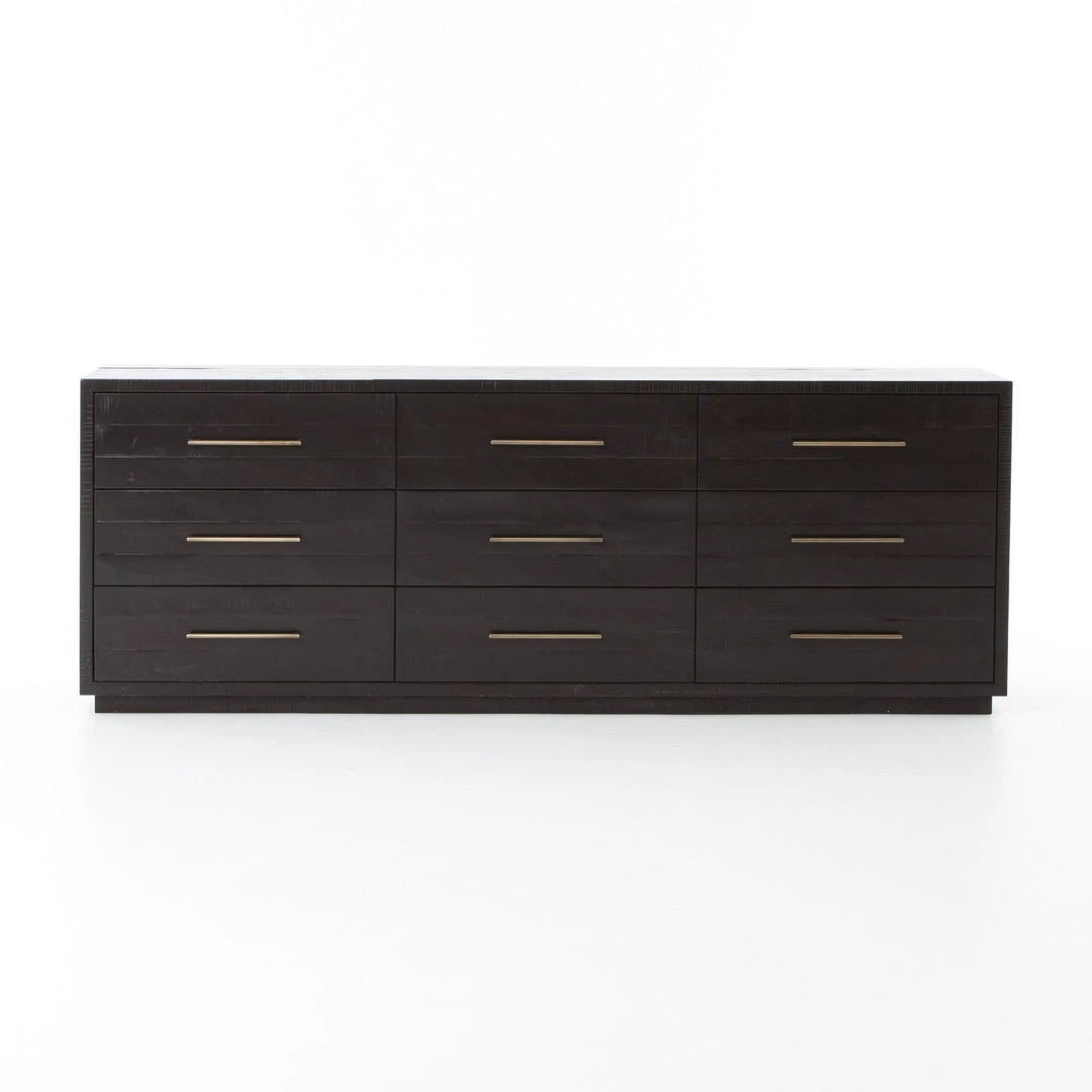 Simple sophistication with a modern edge. Solid acacia forms long, clean lines to lighten the natural depth of a burnished black finish. Brass-finished hardware adds a sleek touch to nine spacious drawers.