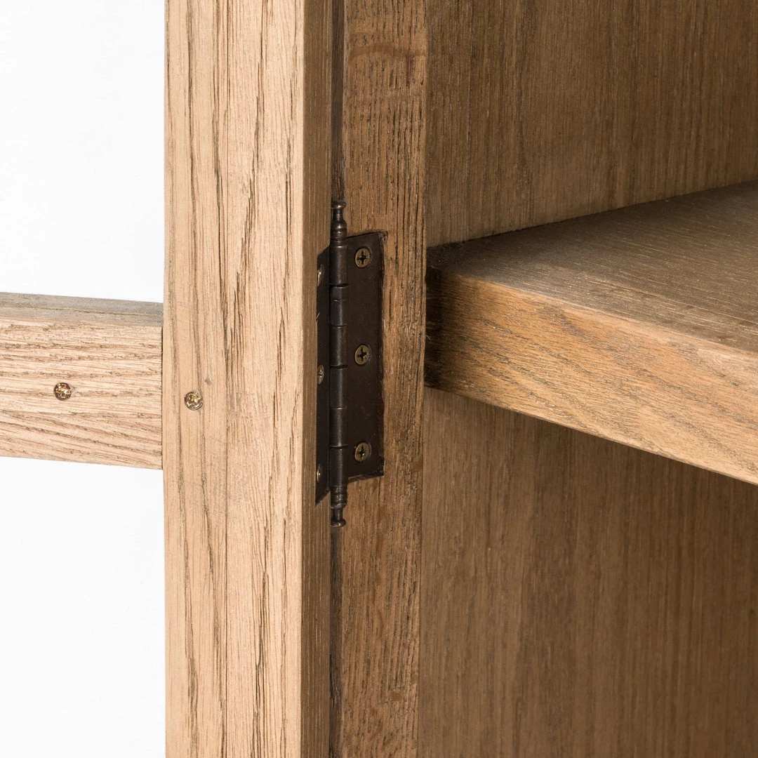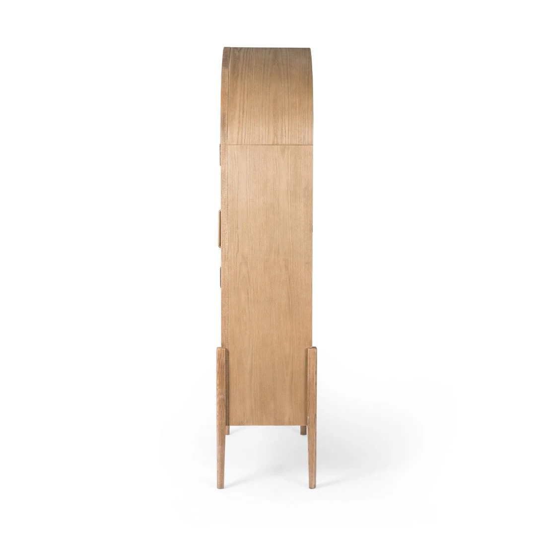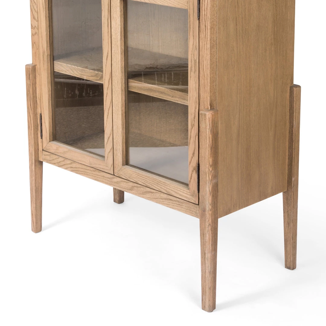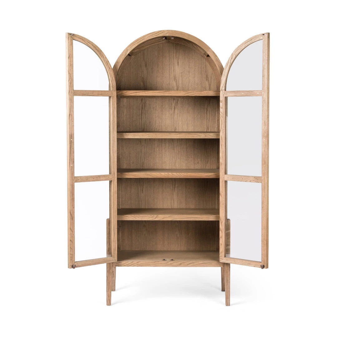 Store it in style. Beautifully shaped cabinetry of solid oak features spacious interior shelving and clear glass front, ready for displaying favorite books, photos and treasures.