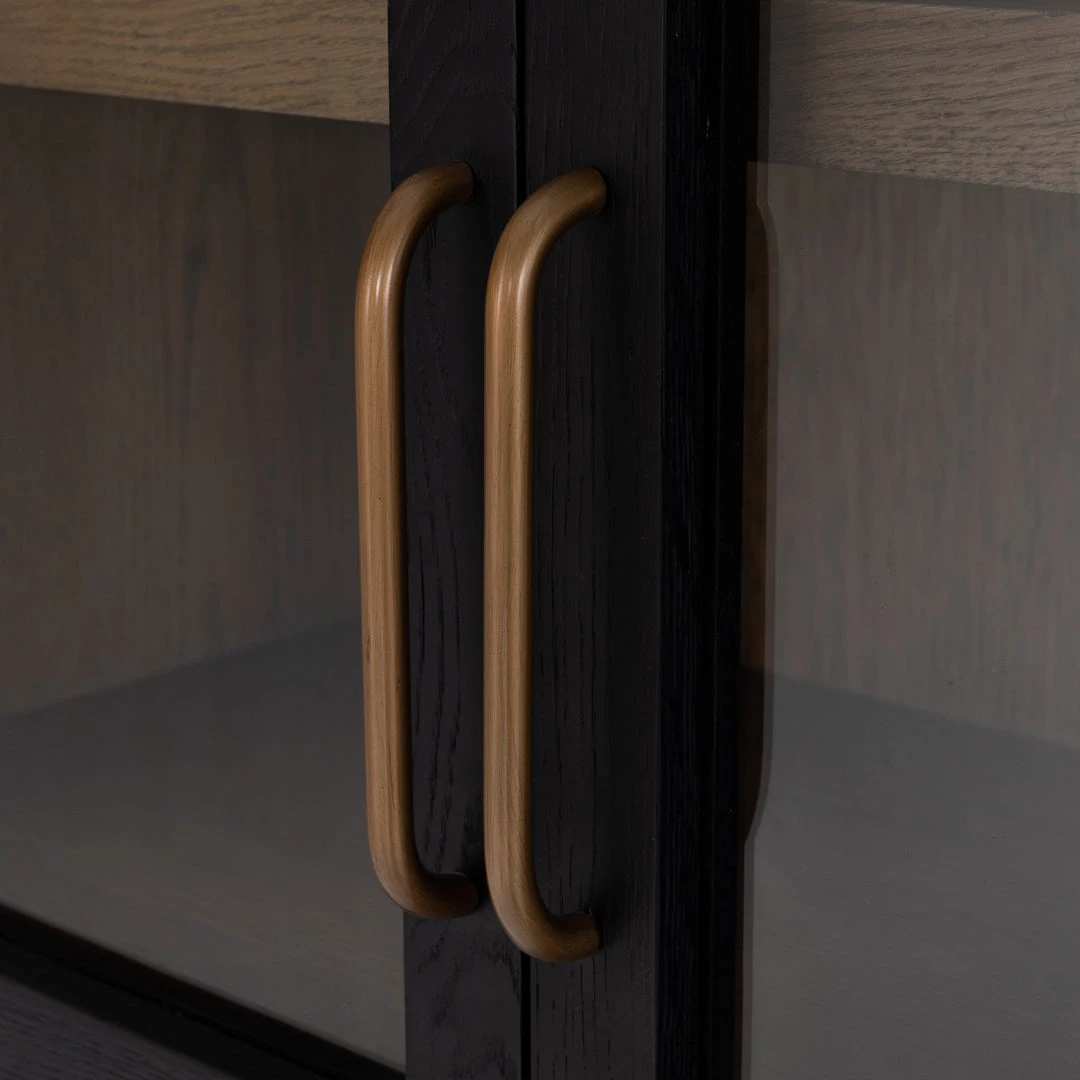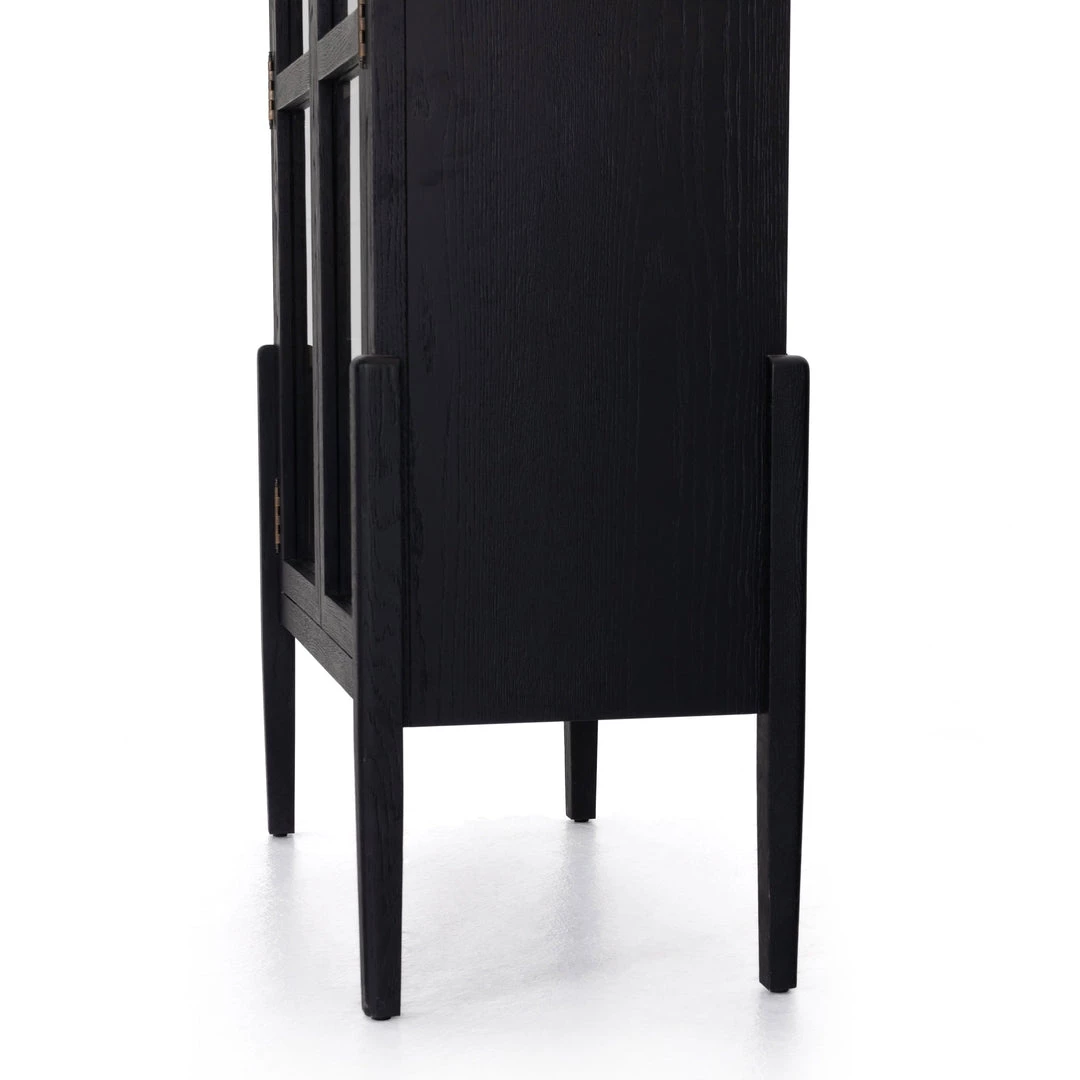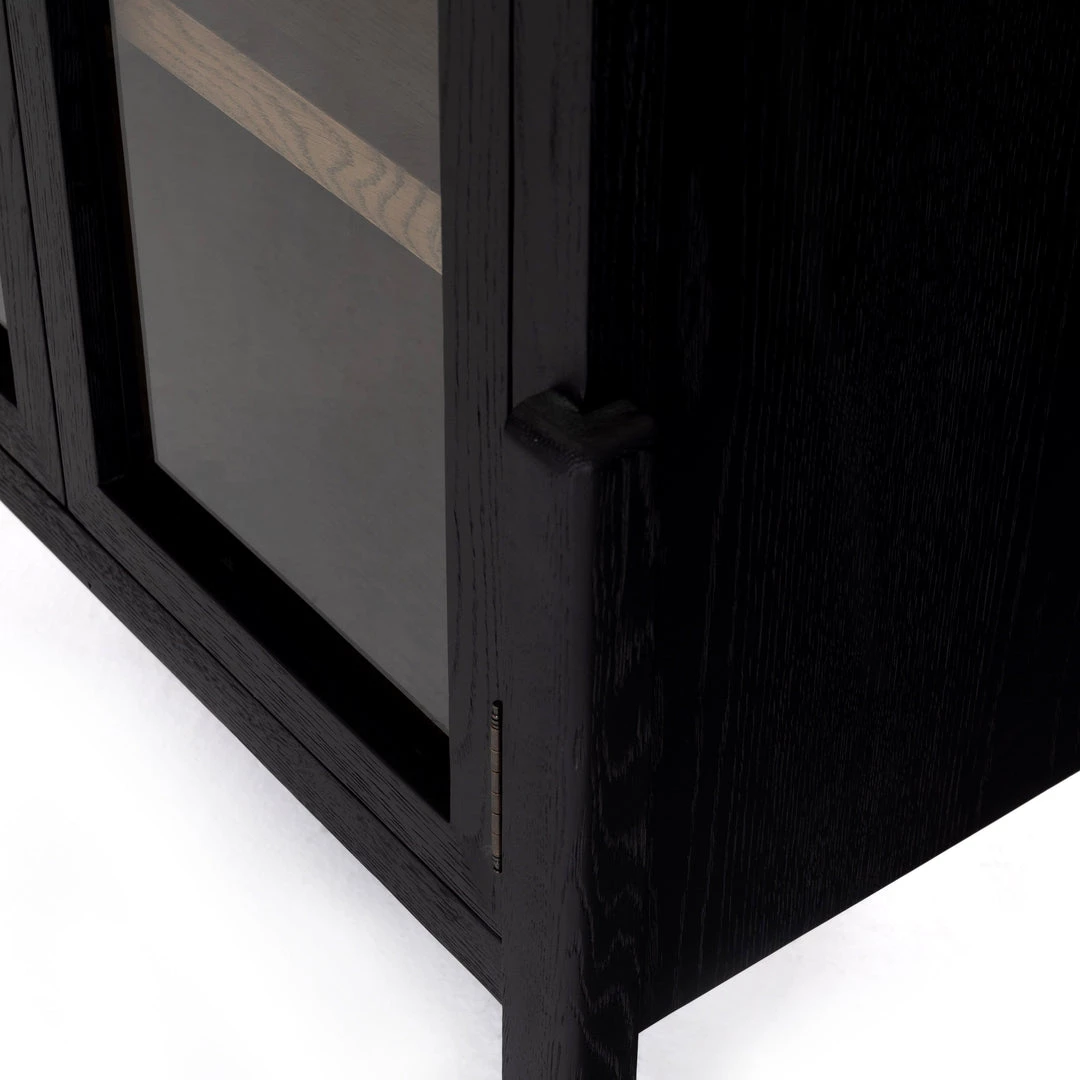 Store it in style. Beautifully shaped cabinetry of black solid oak features spacious interior shelving and clear glass front, ready for displaying favorite books, photos and treasures.