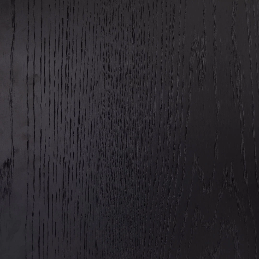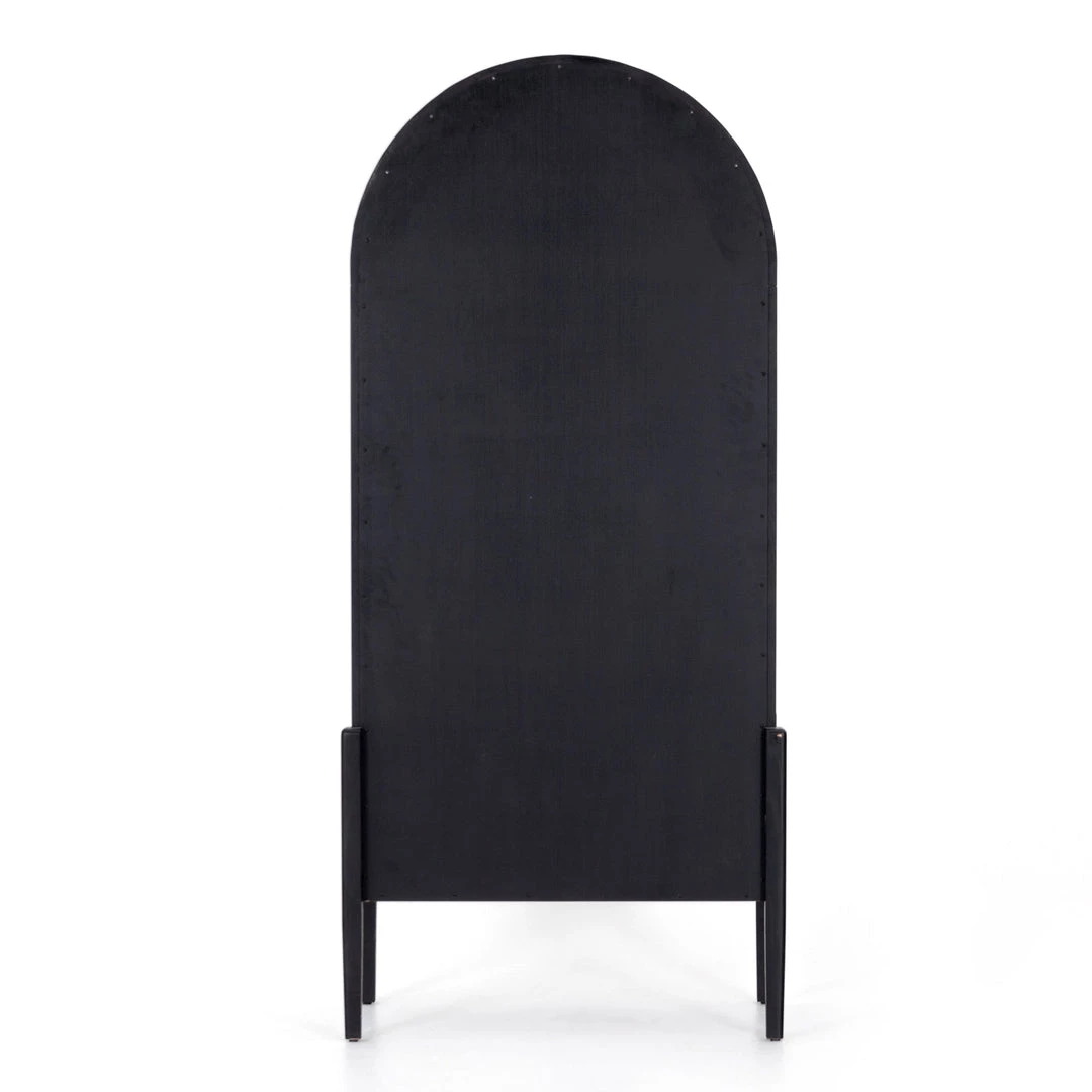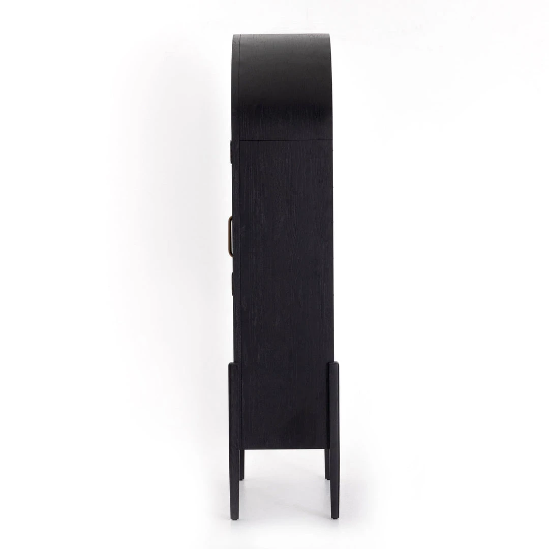 Store it in style. Beautifully shaped cabinetry of black solid oak features spacious interior shelving and clear glass front, ready for displaying favorite books, photos and treasures.