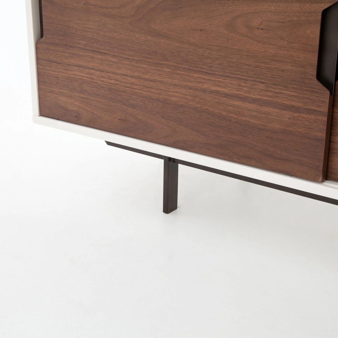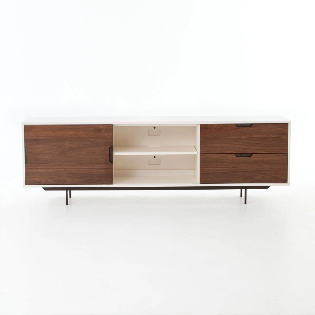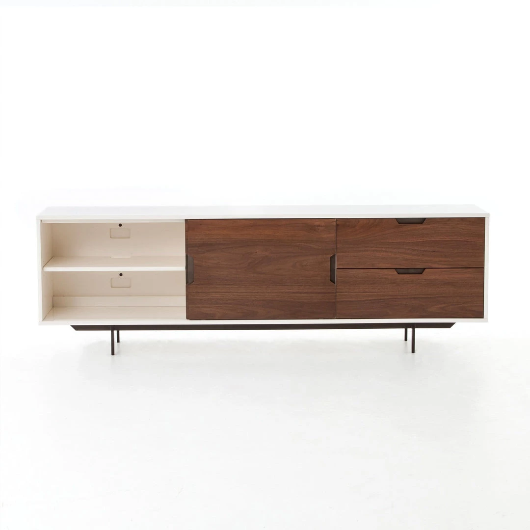 Two-tone style gets the modern-minimalist treatment. White high-gloss lacquer frames rich brown walnut for crisp, clean contrast. Drawers and slide-open shelving for spacious console storage. Four posterior cutouts for cord management.