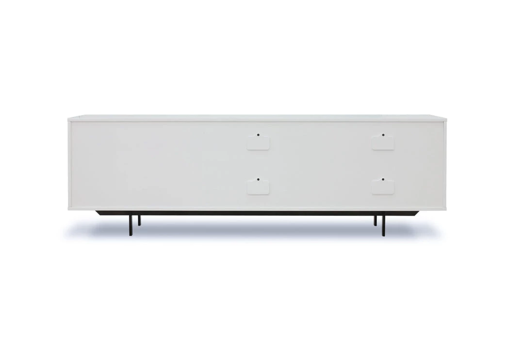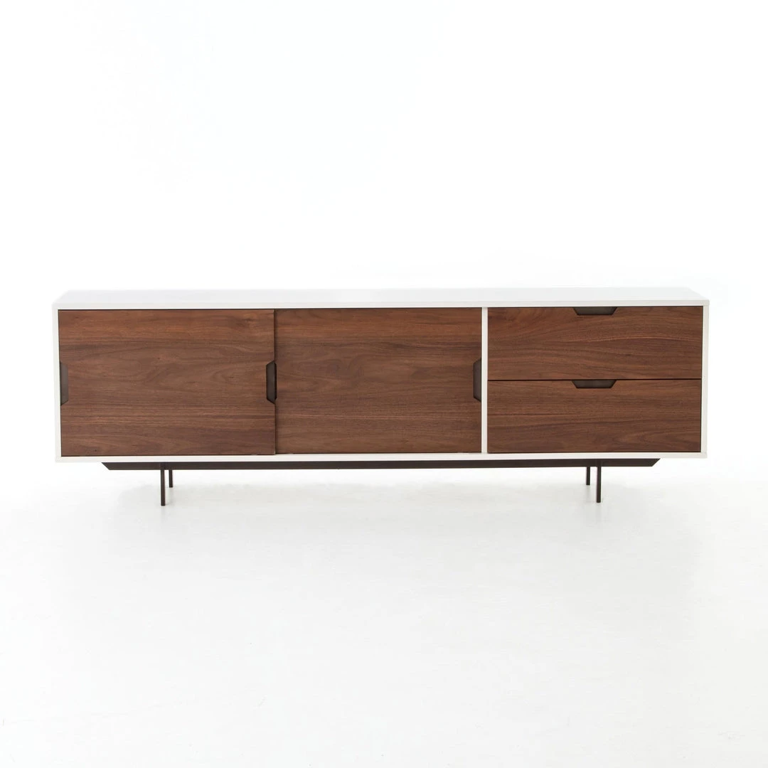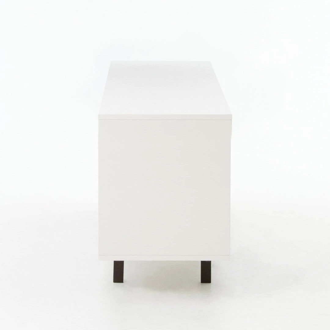 Two-tone style gets the modern-minimalist treatment. White high-gloss lacquer frames rich brown walnut for crisp, clean contrast. Drawers and slide-open shelving for spacious console storage. Four posterior cutouts for cord management.