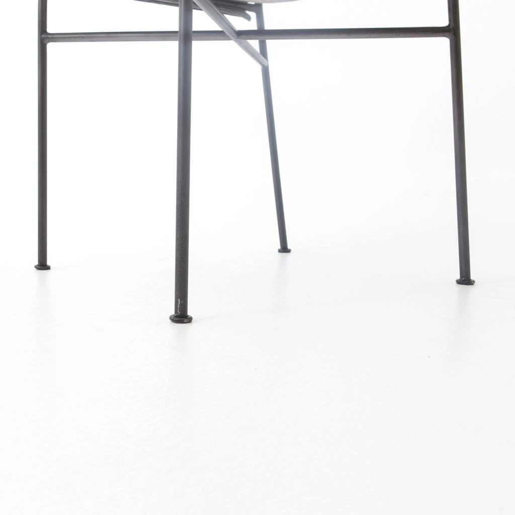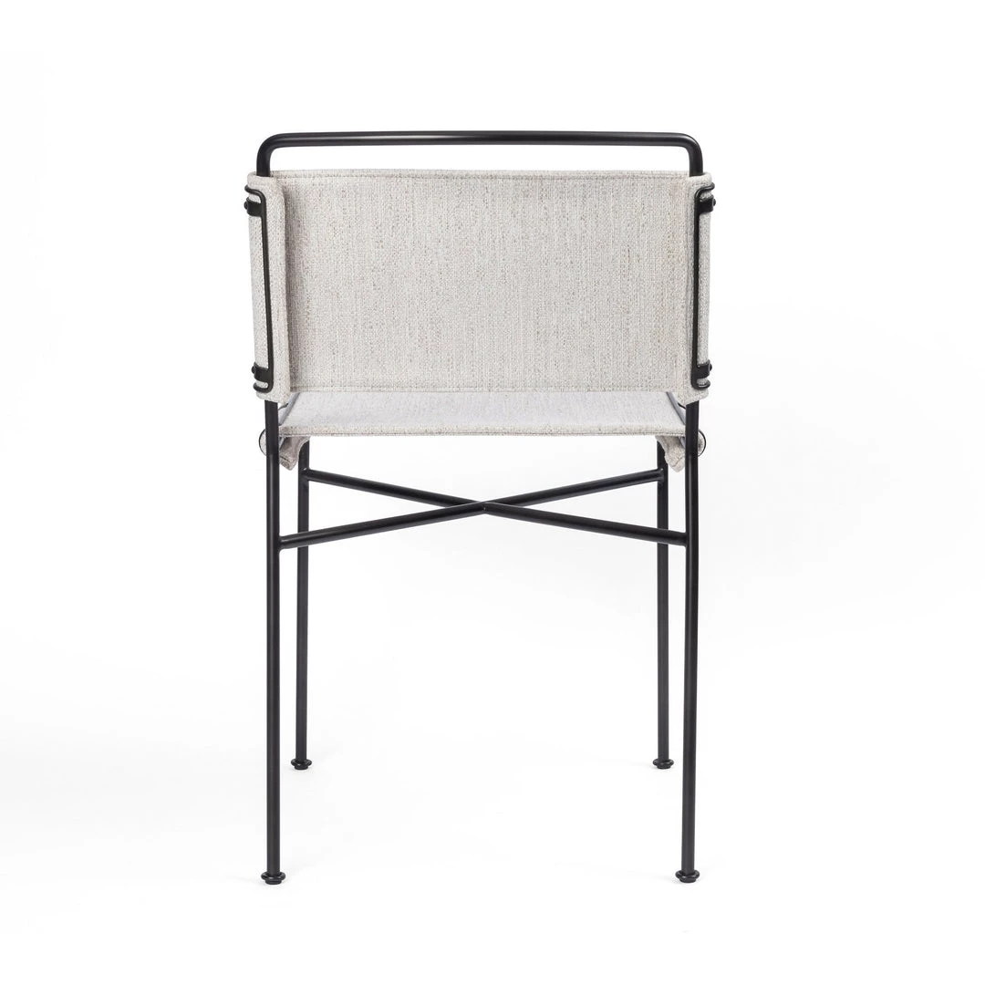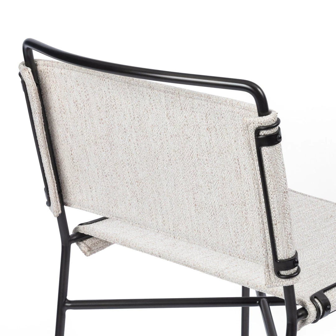 Slim lines meet mixed materials for style and comfort alike. Finished in a waxed black, architecturally inspired iron framing is graced by sleek, simply contoured seating in an invitingly neutral hue.