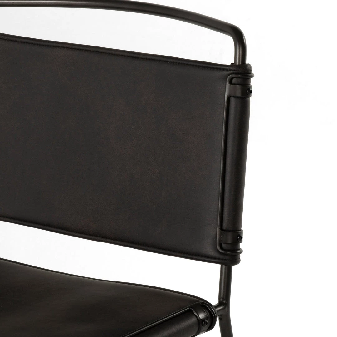 Slim lines and mixed materials combine for ultimate dining comfort. Architecturally inspired steel tubing is graced by simply contoured black faux leather seating.