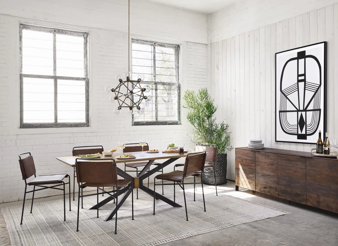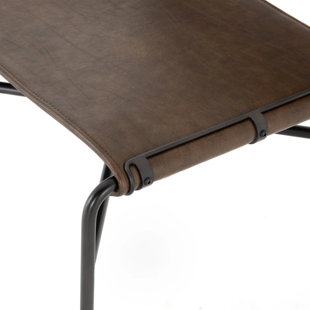 Slim lines and mixed materials combine for ample comfort. Architecturally inspired steel tubing is graced by simply contoured distressed brown seating.