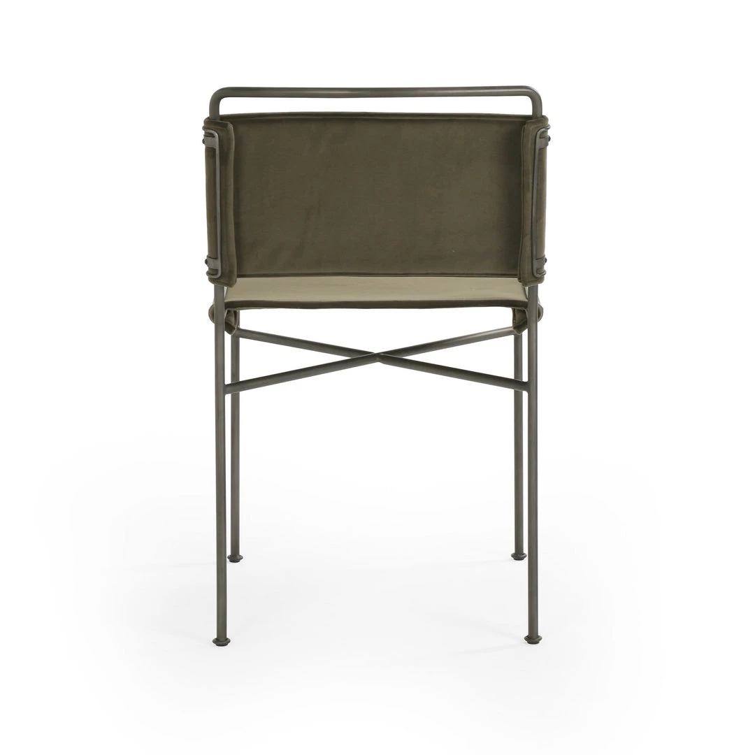 Slim lines and mixed materials combine for ample comfort. Architecturally-inspired iron tubing is graced by simply-contoured seating in an inviting olive. 33” H.