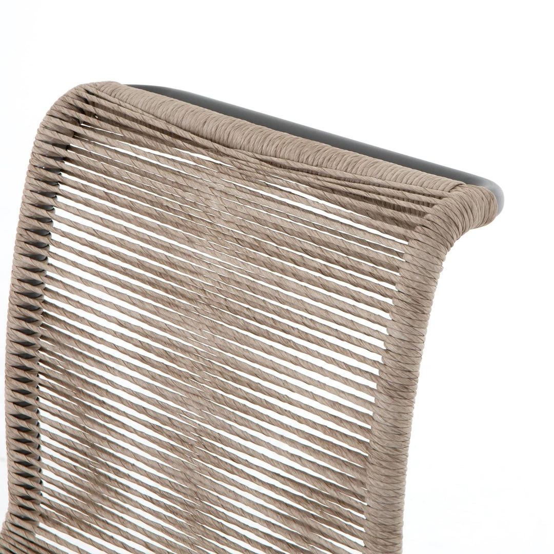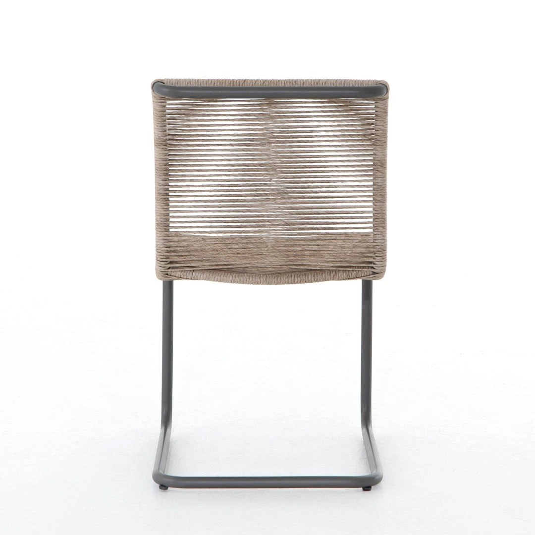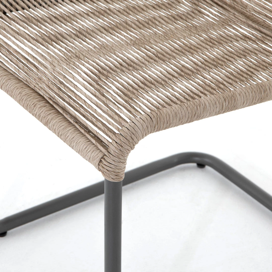 Attractive curvature summons a sit. A slim, gunmetal-finished iron frame supports woven all-weather wicker seating, for a textural twist on cantilever-style seating. Cover or store indoors during inclement weather and when not in use.