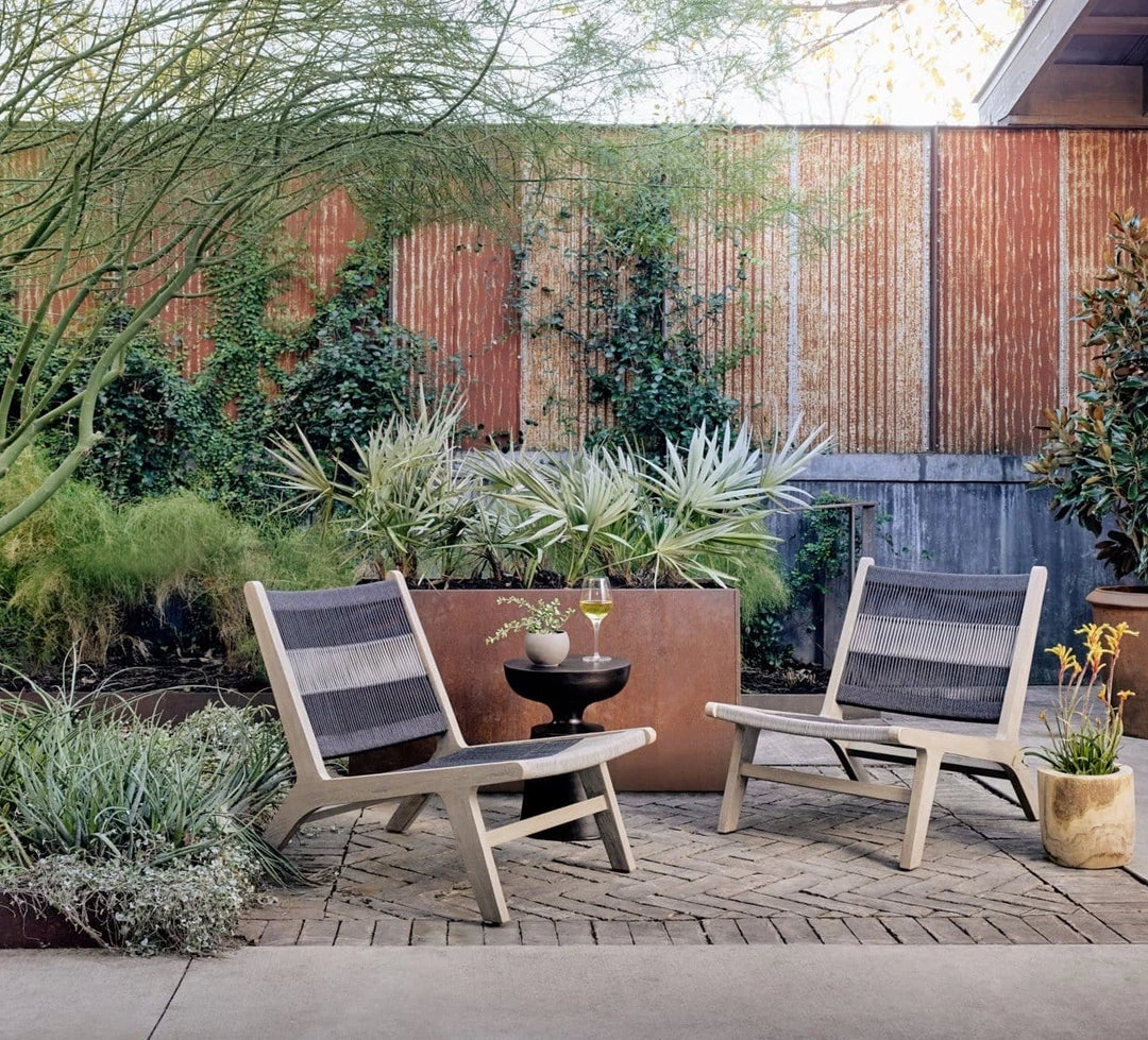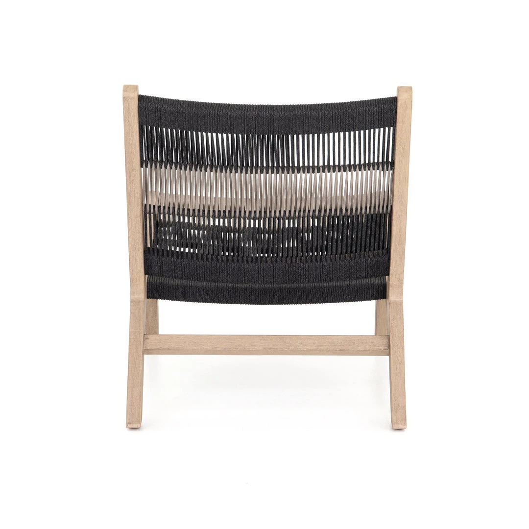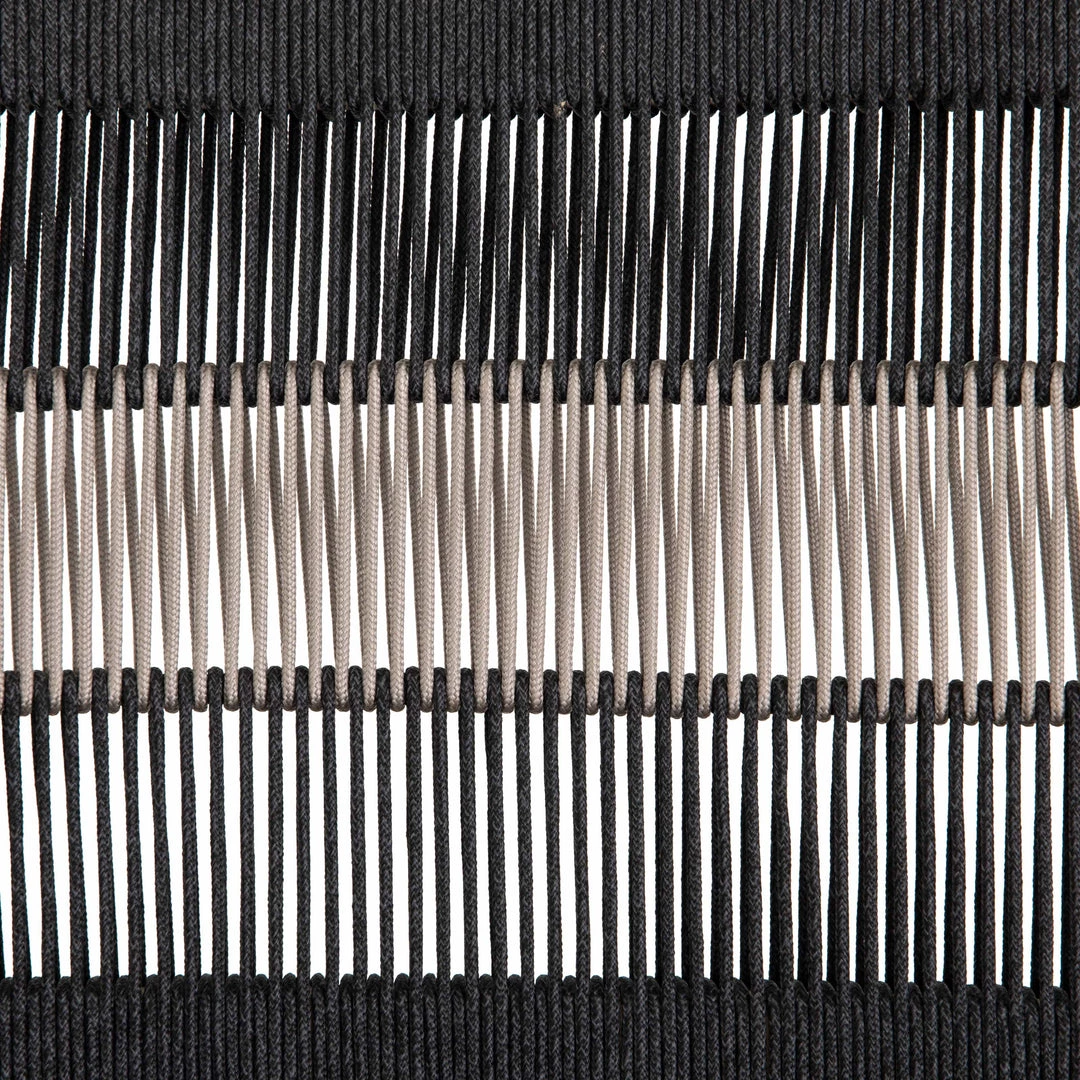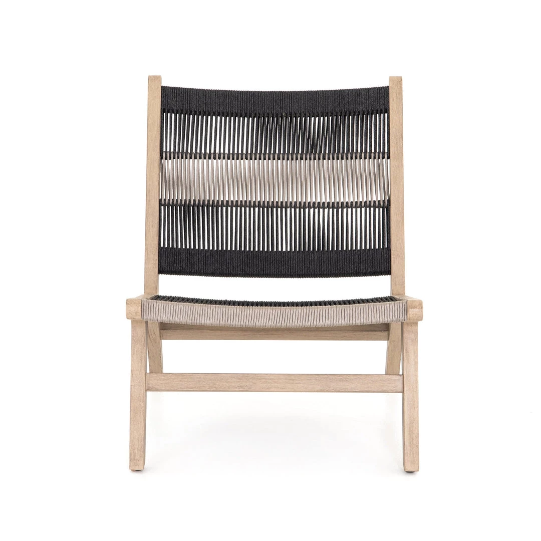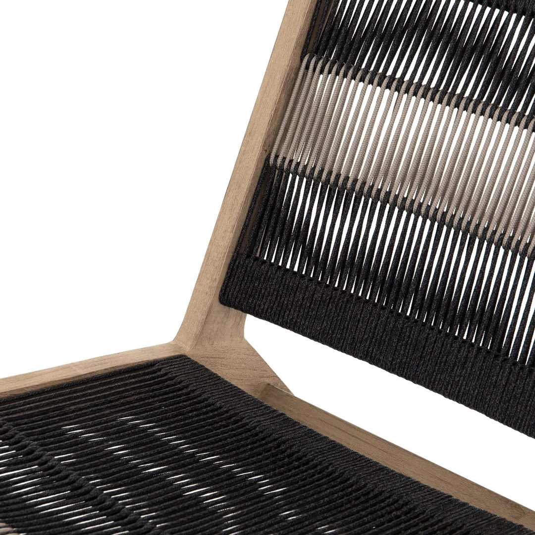 A textural take on outdoor seating. Low, washed brown teak framing welcomes handwoven rope in contrasting greys. Cover or store indoors during inclement weather and when not in use.