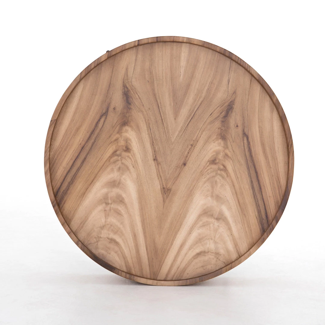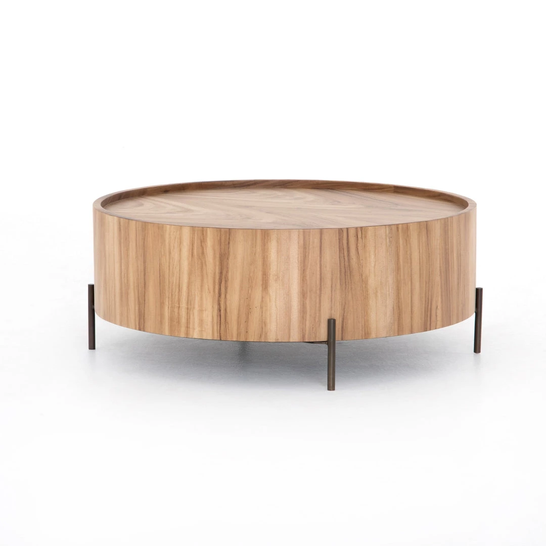 With soft drum shaping and inset top inspired by classic jewelry setting, gold Guanacaste forms a beautifully sculpted silhouette, with natural high and lowlights coursing the entirety of this richly styled coffee table. Bronze-finished iron legs add a hint of modernity.