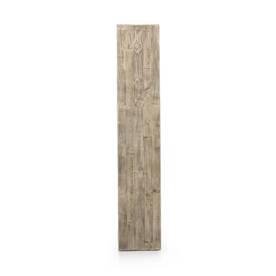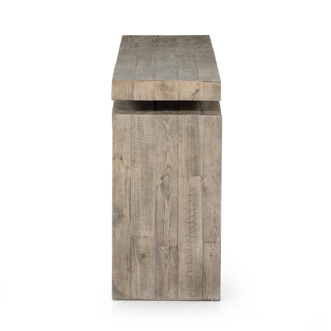 Simple and streamlined to showcase natural beauty. Finished in a weathered wheat, solid reclaimed pine fashions a modern media console with rustic vibes.