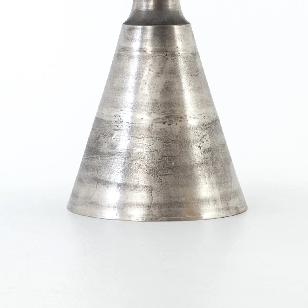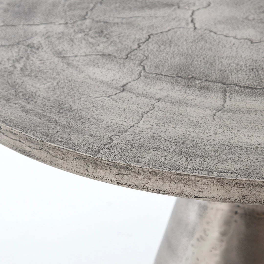 Modern-industrial styling lets in a glimmer of sheen. Solid aluminum is finished in raw antique nickel for a visually-arresting takeaway with natural character. A stylized spin on the classic pedestal shape. Safe for outdoors. Cover or store indoors during inclement weather and when not in use.