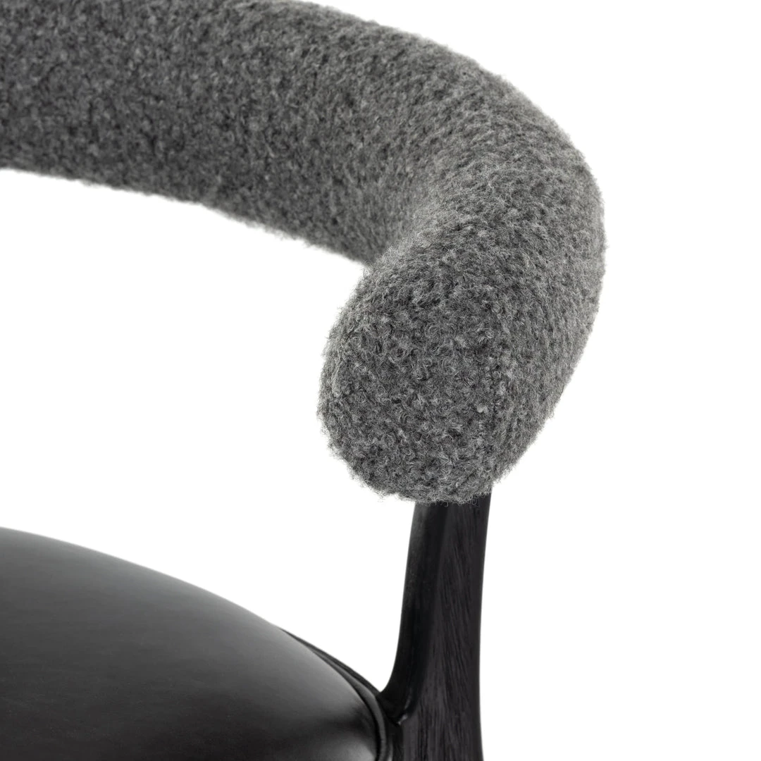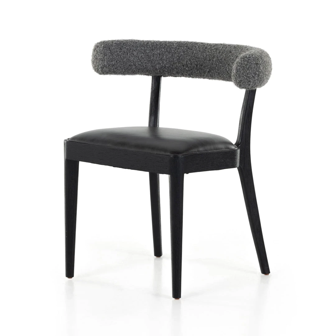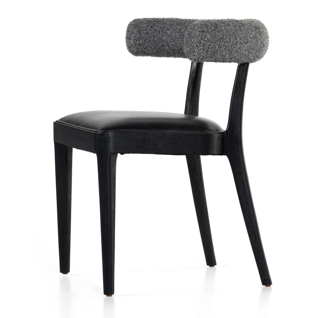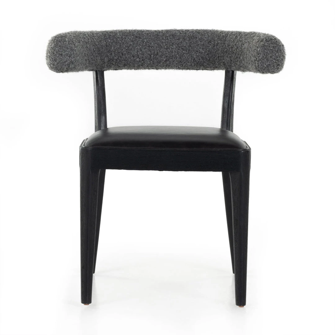 Style and comfort fuse in a slim-profile dining seat of black top-grain leather, framed by matte black parawood. A sheepskin-wrapped back makes for a sleek, monochromatic look.