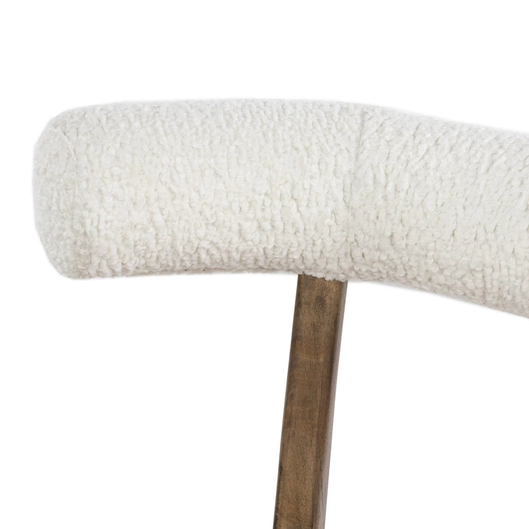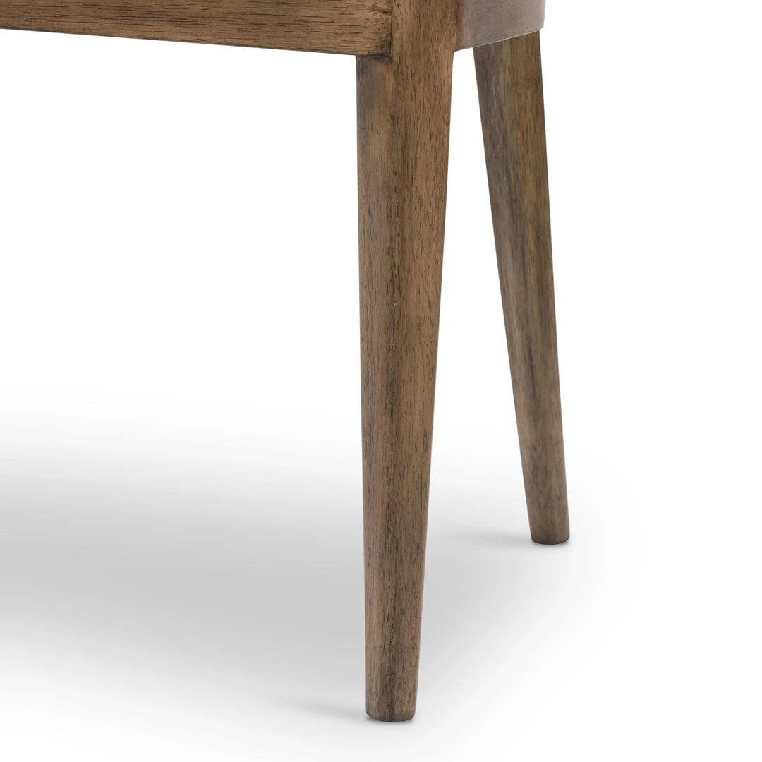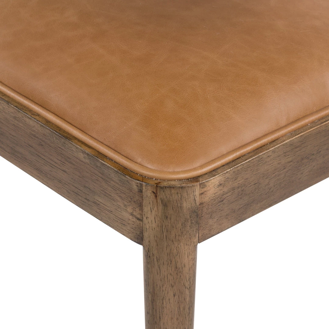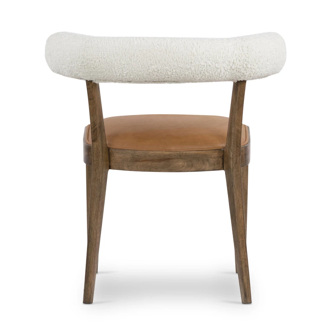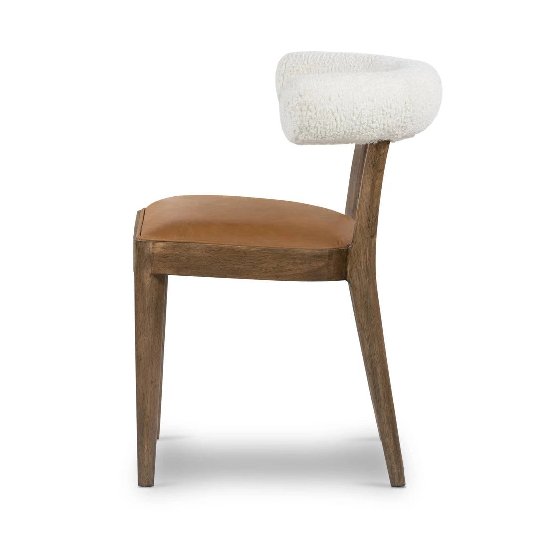 Style and comfort fuse in a slim-profile dining seat of tan top-grain leather, framed by toasted parawood with a sheepskin-wrapped back.