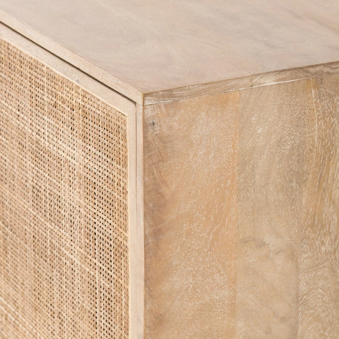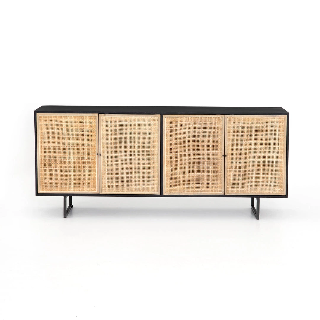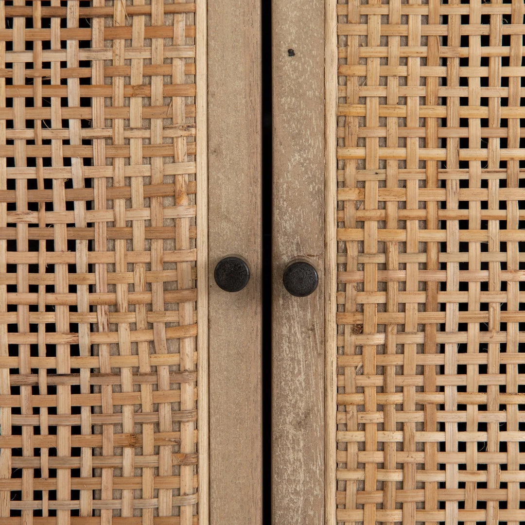 Midcentury-inspired style with an organic twist. Surrounded by brown-washed solid mango casing, cane door fronts weave for a look of great depth. Angular iron legs offer an intriguing contrast of texture and tone.