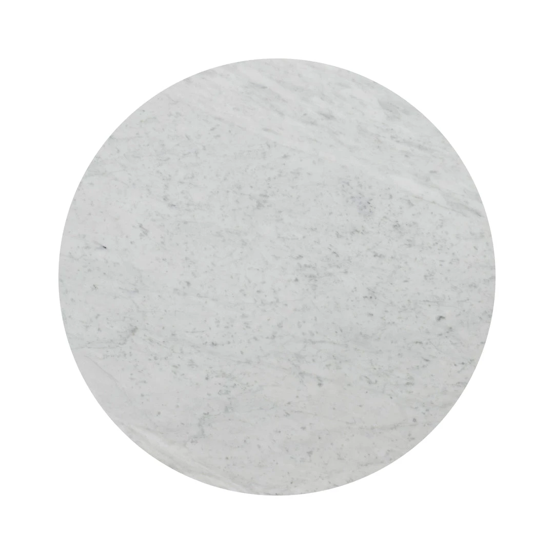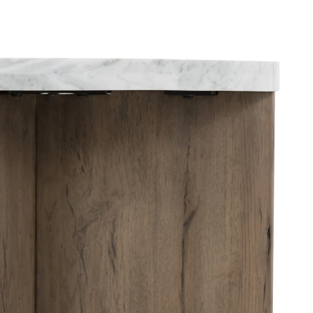 Mixed materials make the table. Finished in a rustic grey, thick-cut oak forms a chunky pedestal base for a rounded tabletop of white Italian marble, with beautifully subtle natural veining.