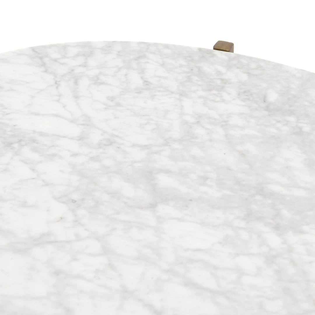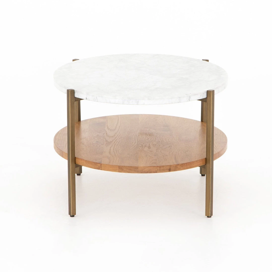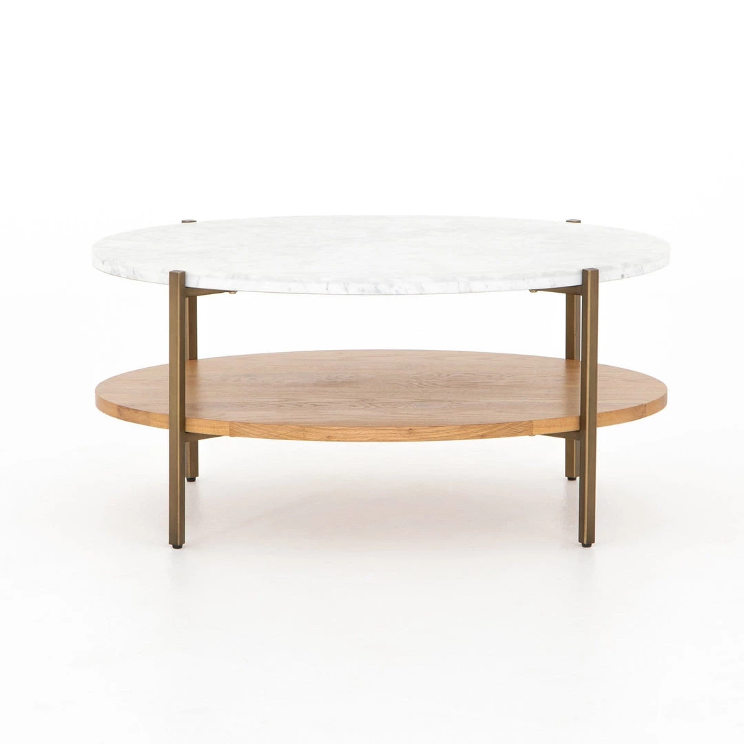 Mixed materials make a strong case for style. Open shelving of natural oak and a white marble top appear to float within slight framing of golden brass-finished antimony, ready to welcome media and more.