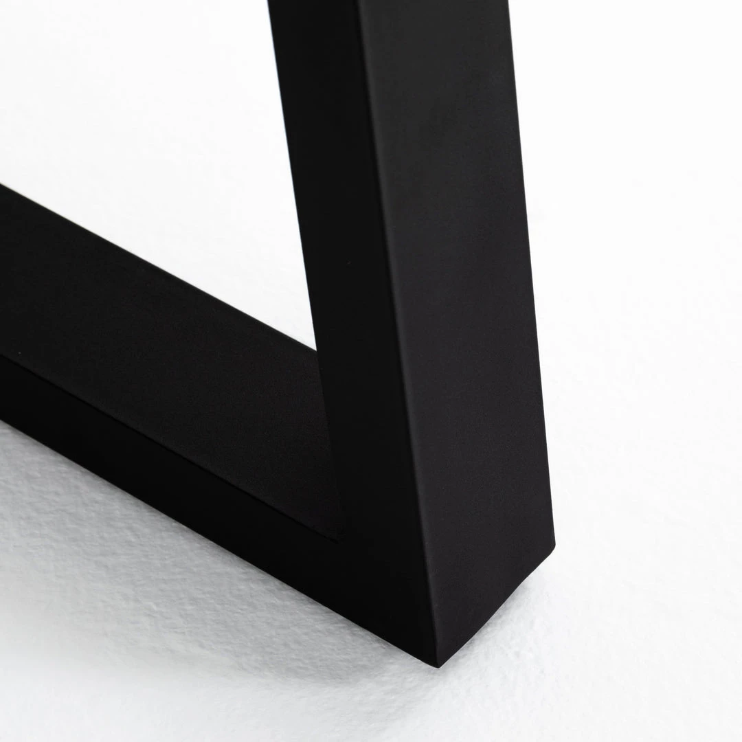 A strikingly simple poly-resin top derived from river sand is polished to a smooth sheen, while an angular black iron base adds architectural appeal to this outdoor-friendly dining table. Slight color variance is to be expected, and speaks to lava stone’s organic nature. Cover or store indoors during inclement weather and when not in use.