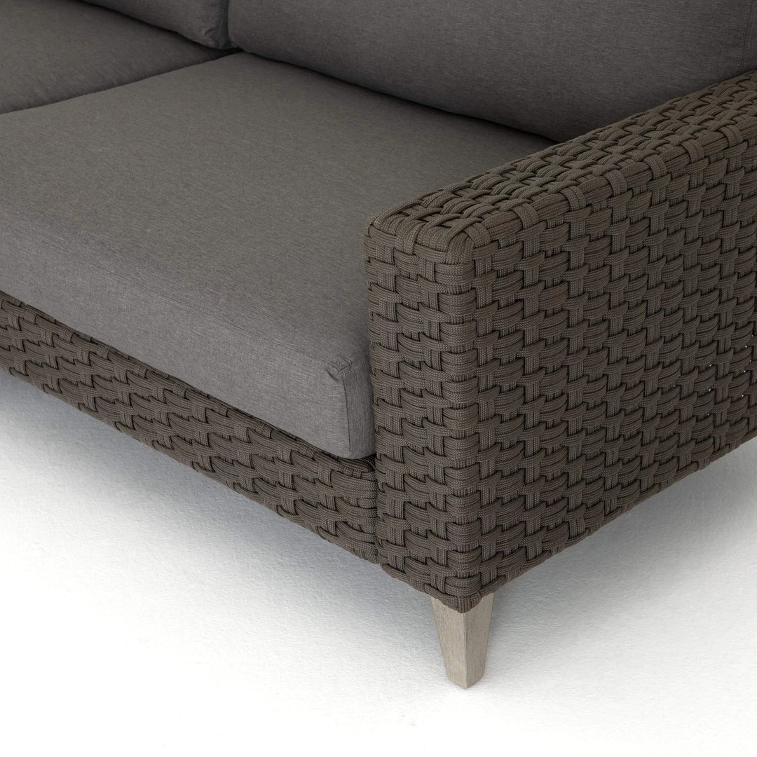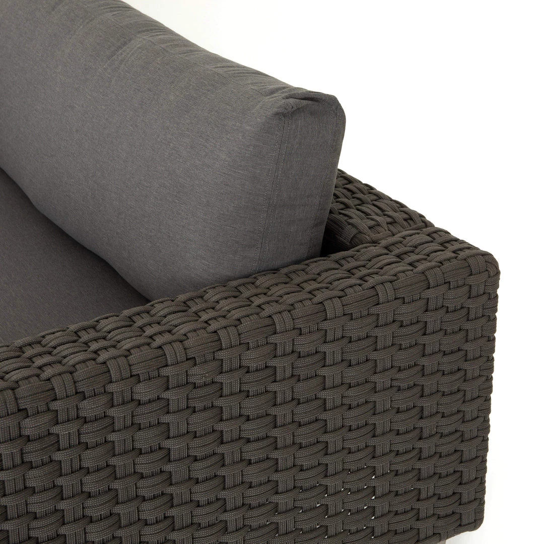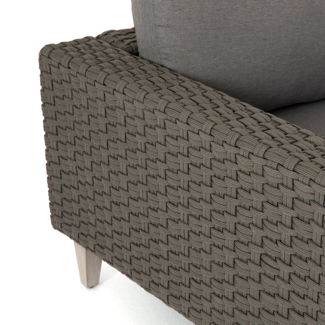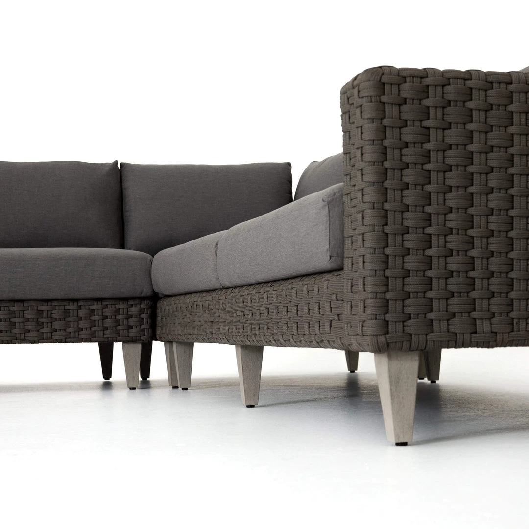 An outdoor-friendly take on modular lounging, charcoal rope weaving frames soft, durable grey cushioning. Cone-tapered teak legs for a shapely finishing touch. Safe for outdoor spaces. Cover or store indoors during inclement weather and when not in use.