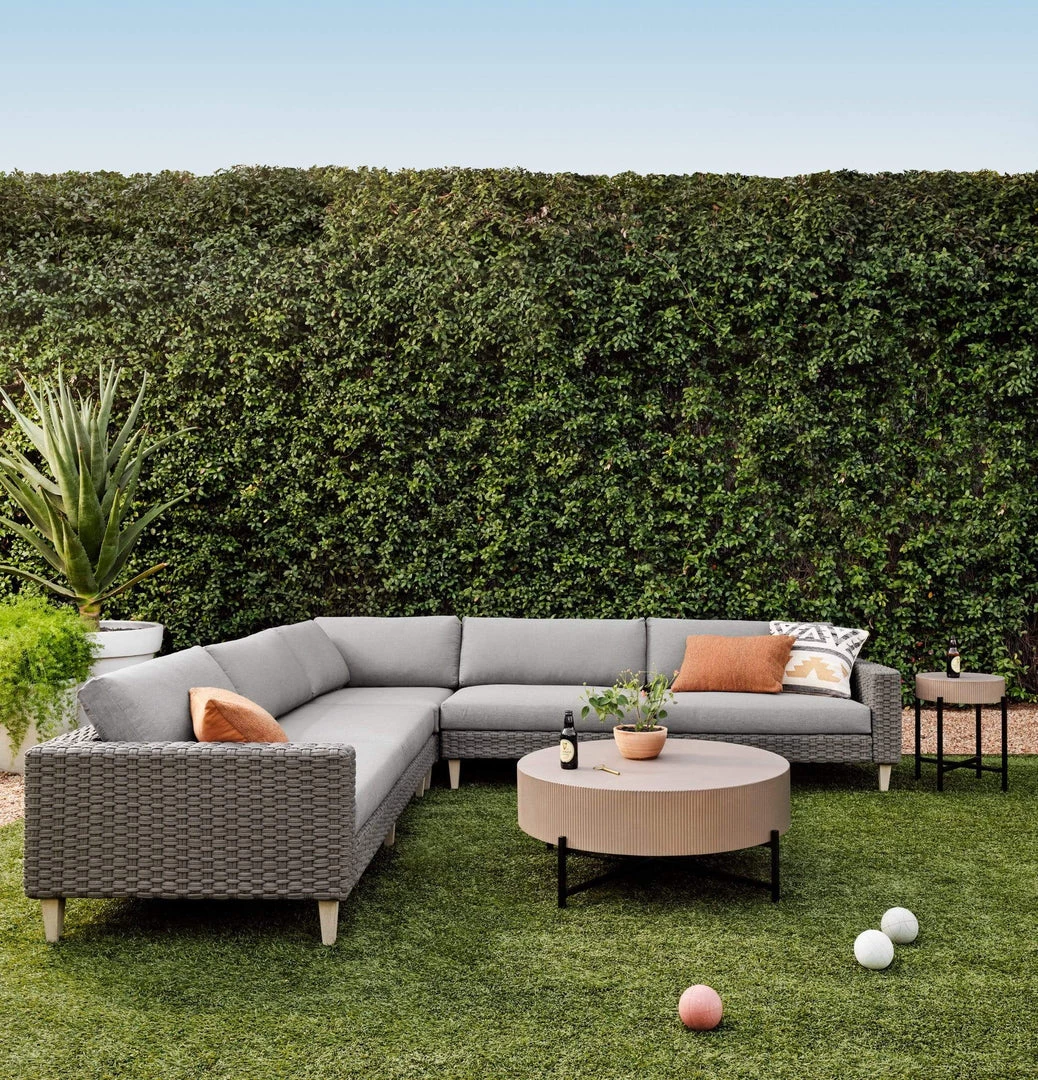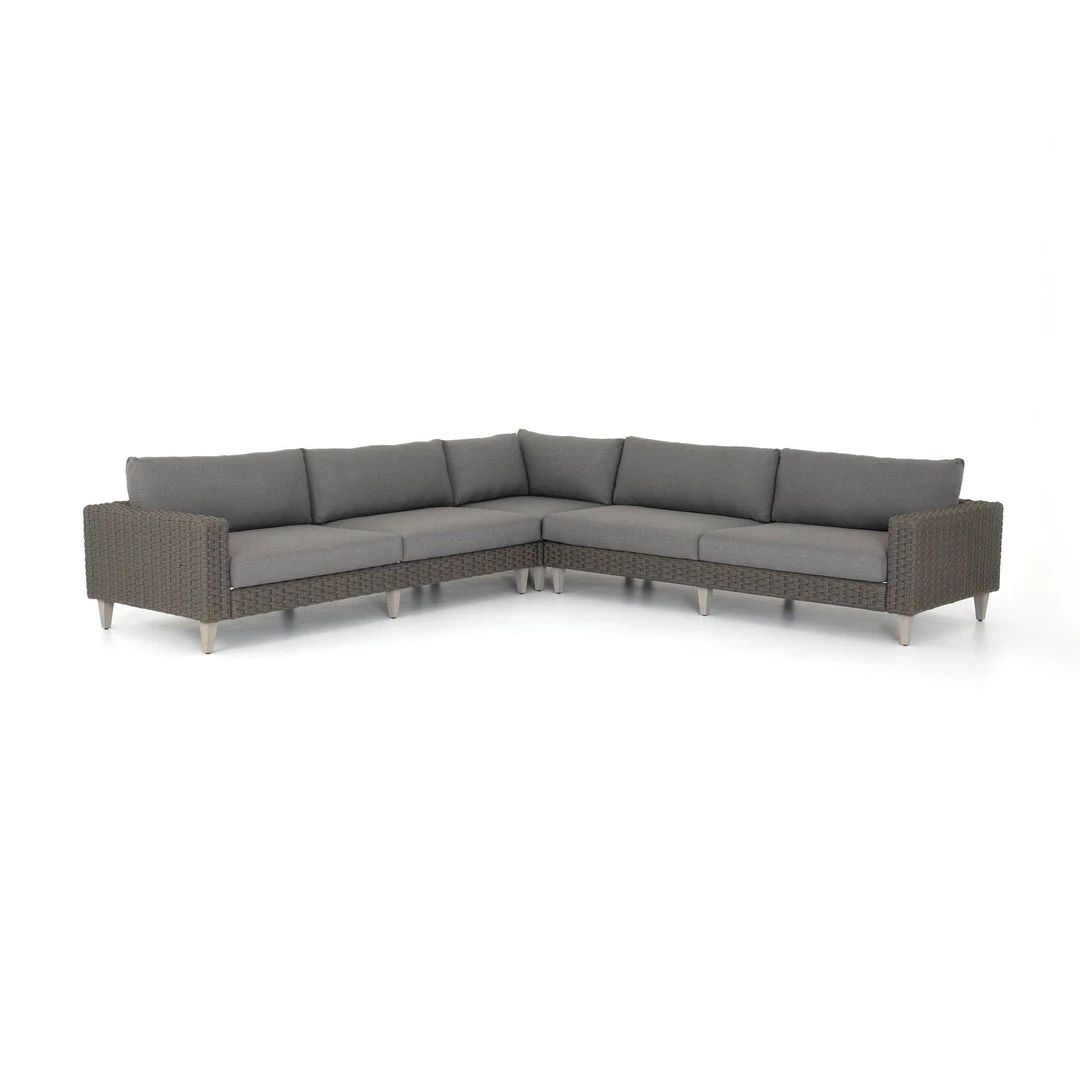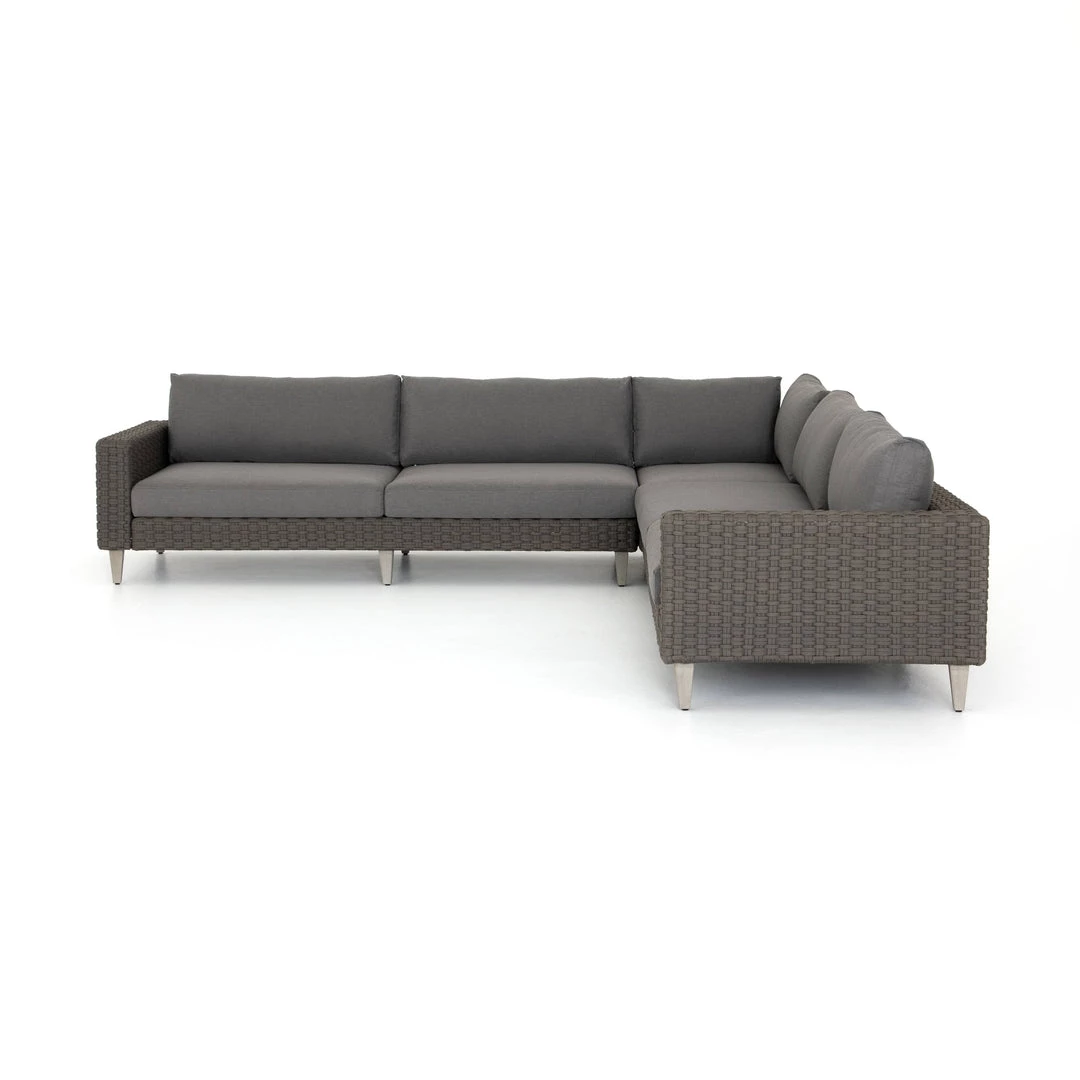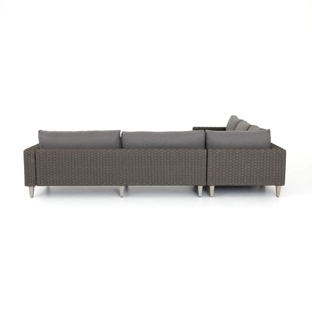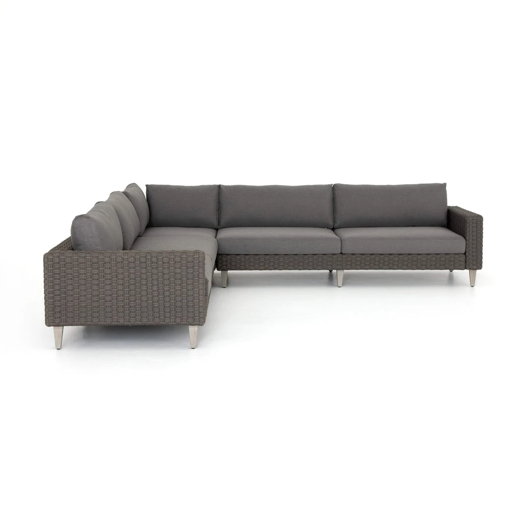 An outdoor-friendly take on modular lounging, charcoal rope weaving frames soft, durable grey cushioning. Cone-tapered teak legs for a shapely finishing touch. Safe for outdoor spaces. Cover or store indoors during inclement weather and when not in use.