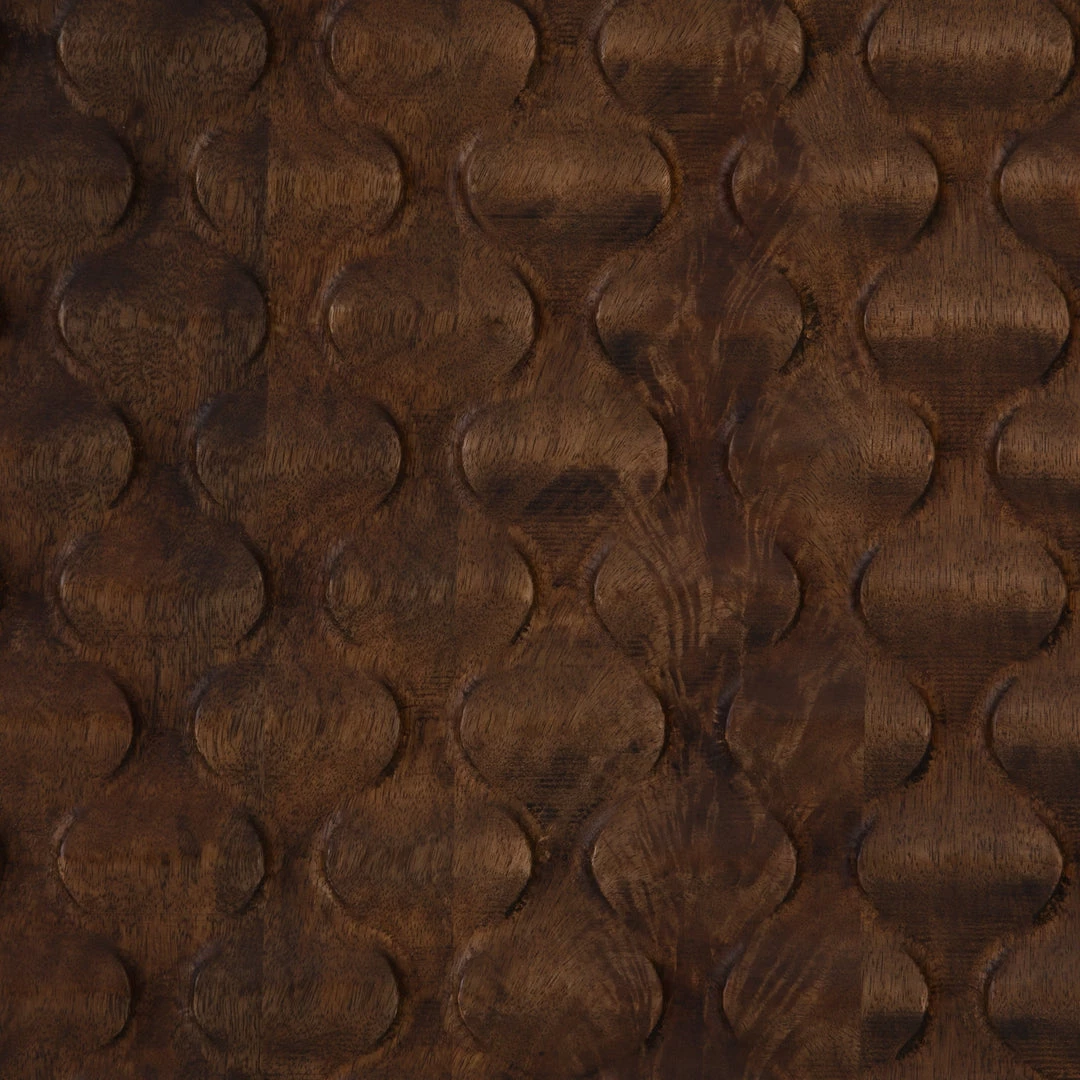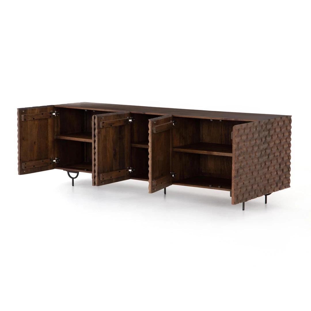 Long and low-styled. Antique brown mango wood adopts intricate CNC carving for a uniquely textured look. Rounded iron legs offer an intriguing material mix with a modern touch. Interior shelving for media storage and rear cutout for cord management.