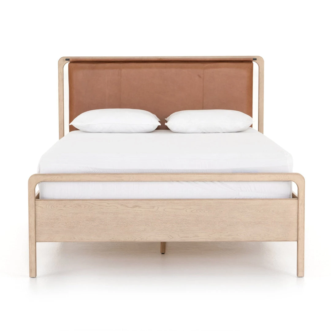 Light, clean and totally unique. Washed oak frames a sling-style headboards of tan top-grain leather, for a modern material mix and soft look.