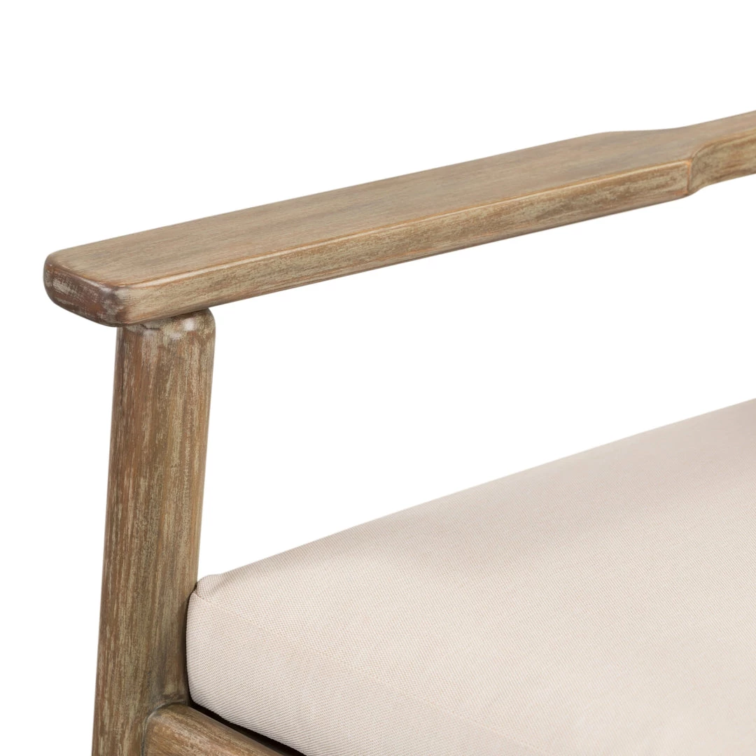 Mixed materials prime for outdoor dining. A shapely frame of FSC-certified eucalyptus features a textural back of woven rope, paddle arms and comfy, Velcro-secured box cushioning in a versatile ivory. Cover or store indoors during inclement weather and when not in use.