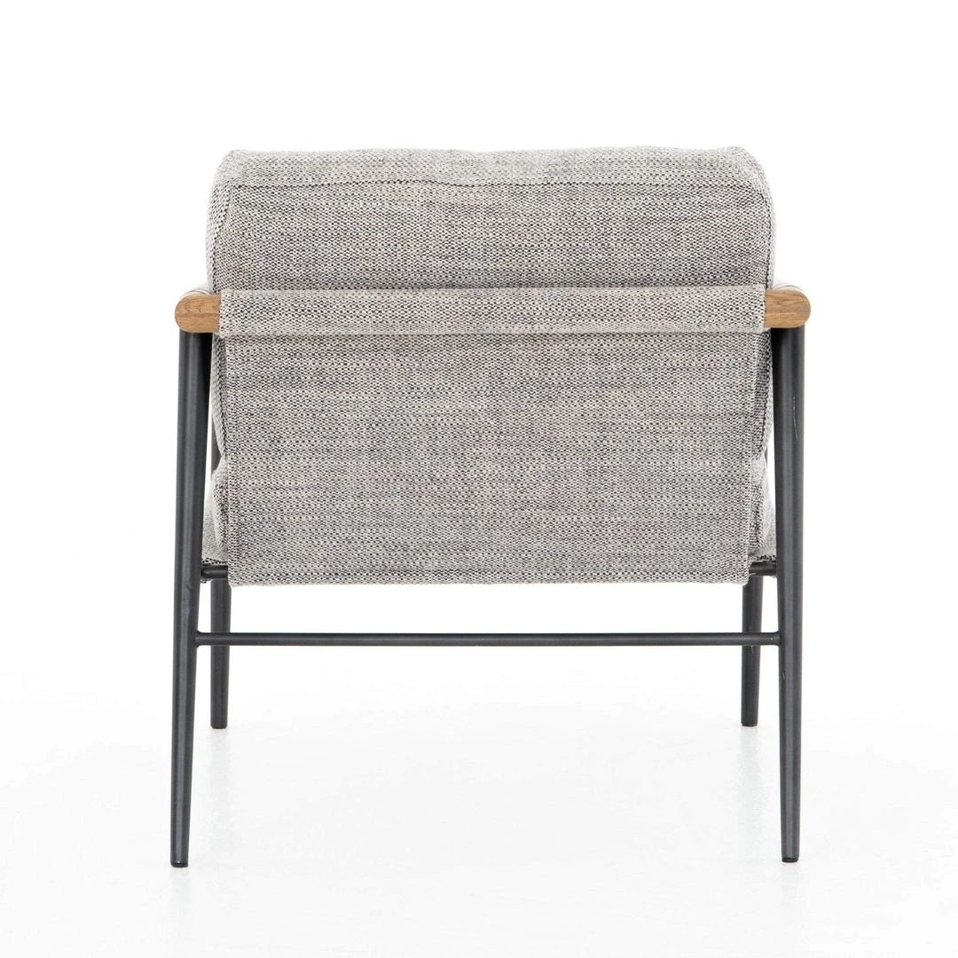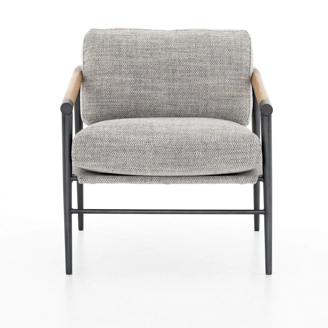 Textural grey seating of performance-grade upholstery, with angular arms of exposed oak providing fresh contrast. Slim, carbon-finished steel legs for a dose of modern-industrial edge.