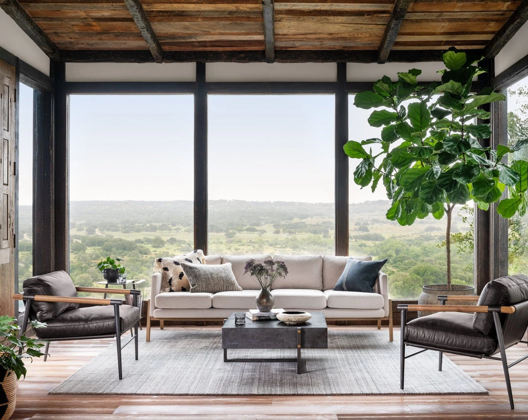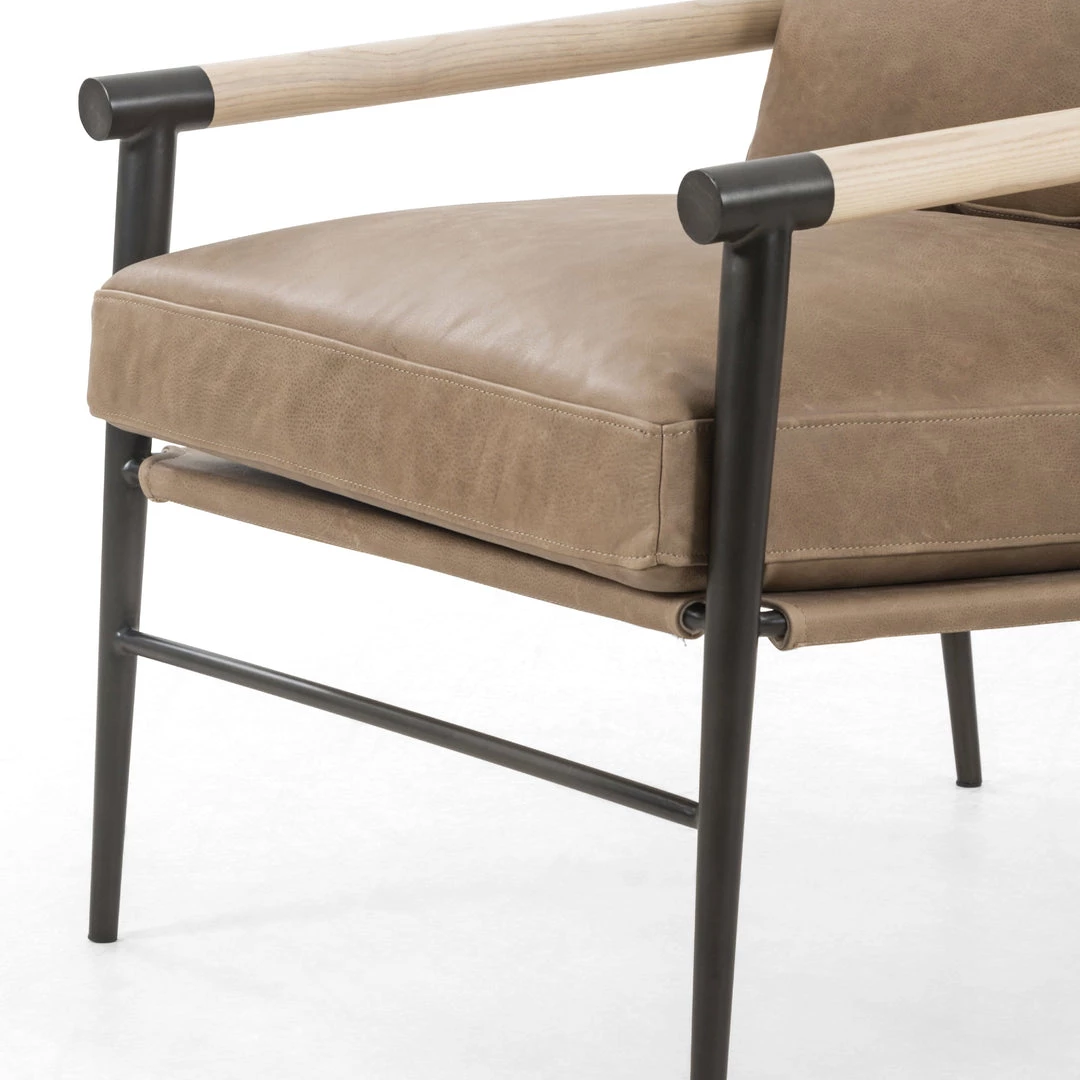 Timelessly classy with a touch of modern edge. Slim, black steel frames buttery, pronounced seating of tan top-grain leather, with whitewashed ash accentuating angular arms.