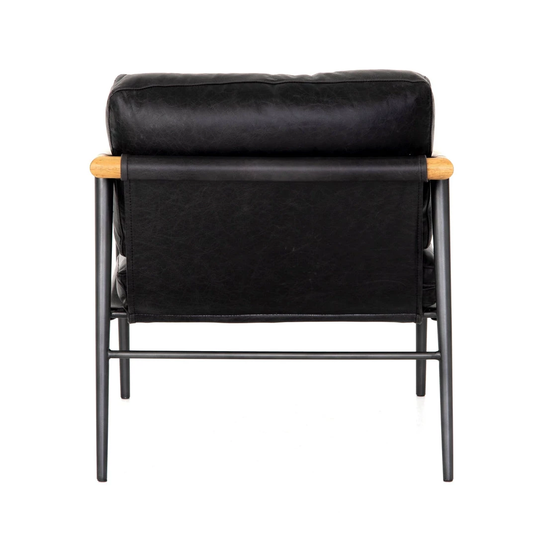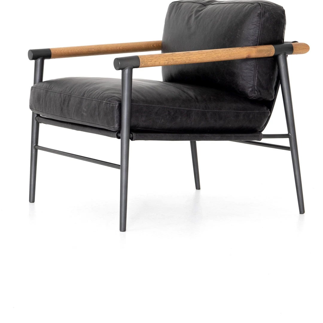 Buttery black seating of Four Hands-excusive top-grain leather, with angular arms of exposed oak providing fresh contrast. Slim, carbon-finished steel legs for a dose of modern-industrial edge.
