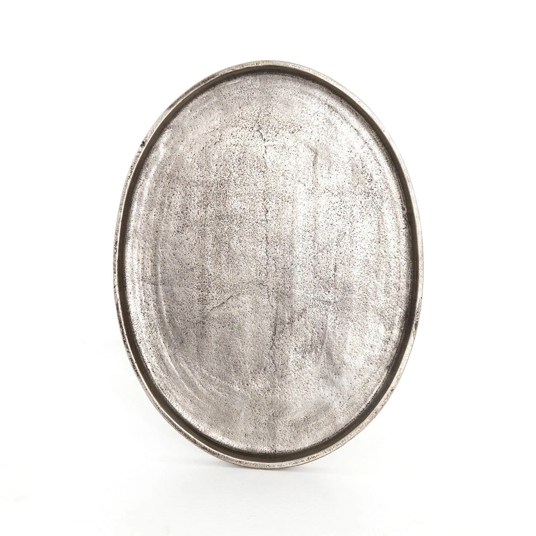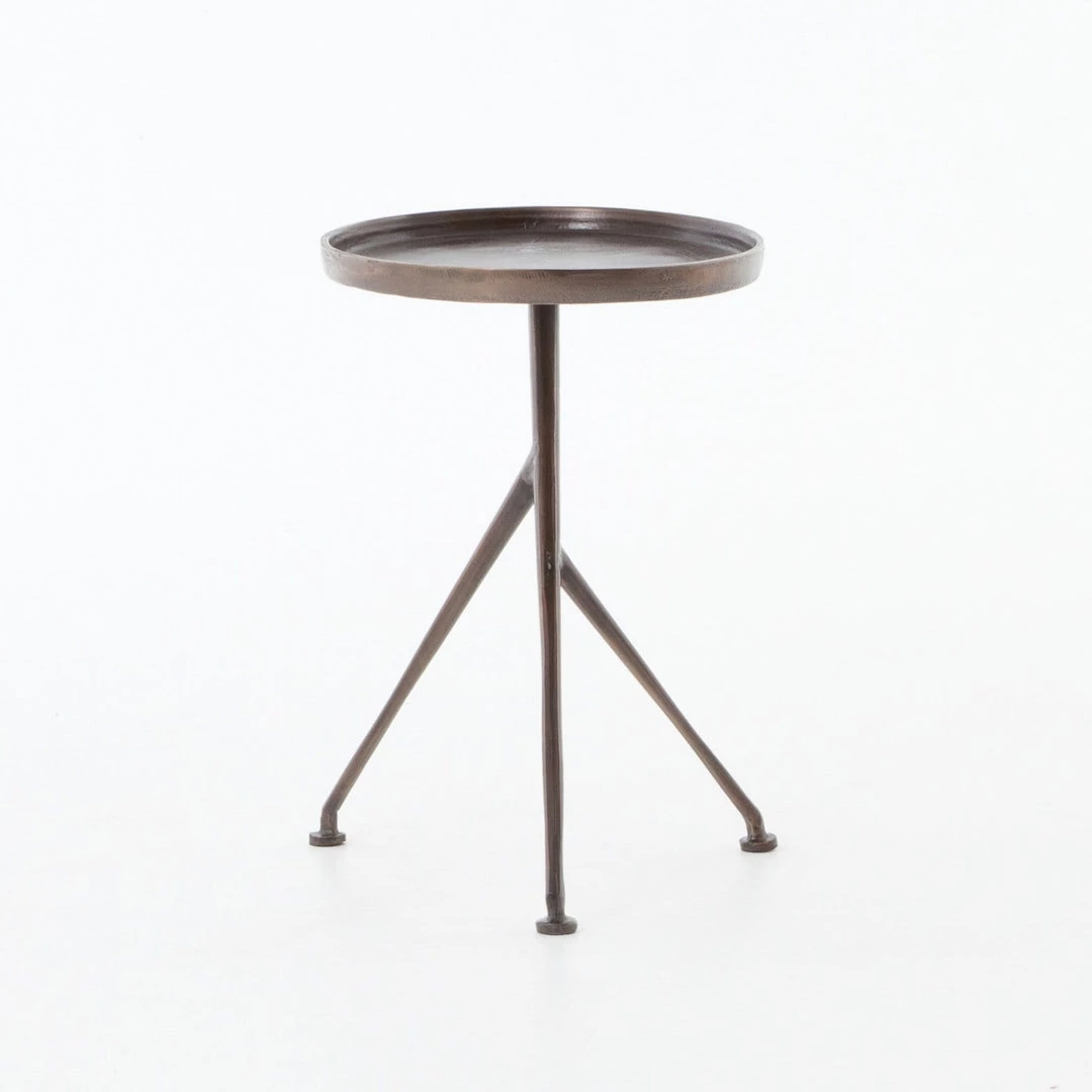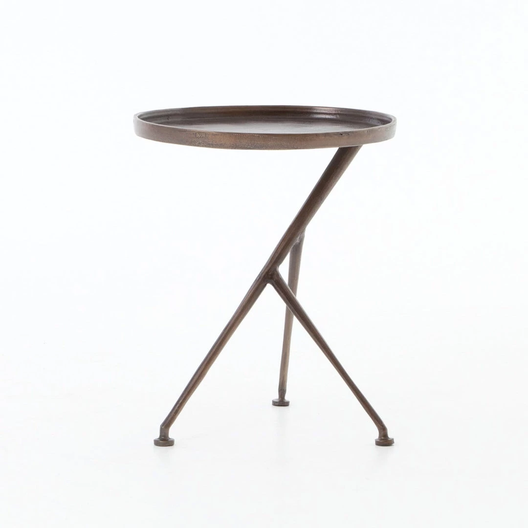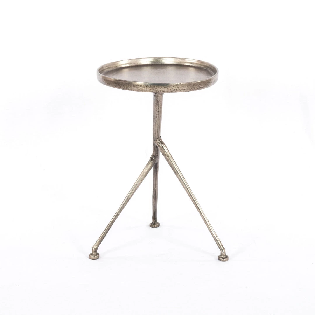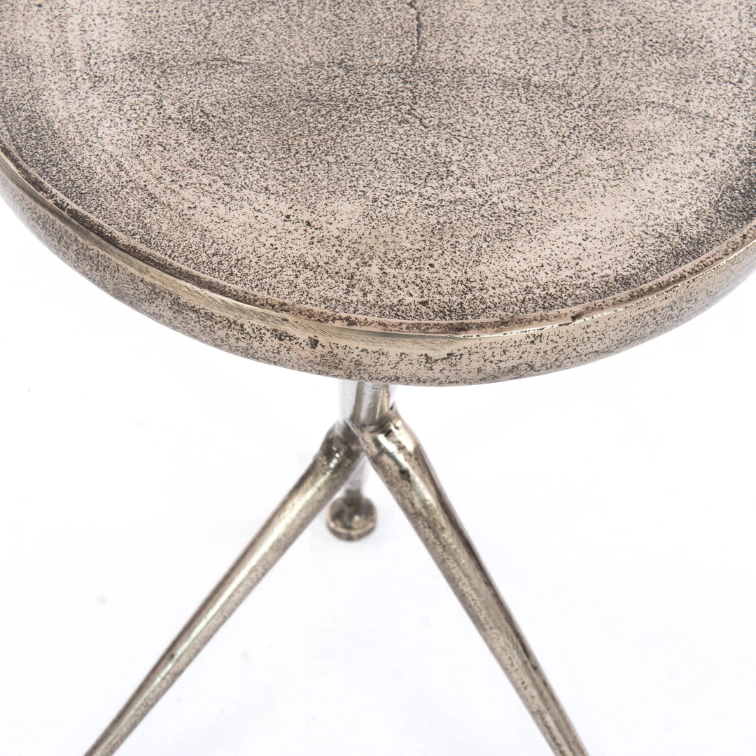 The tripod table with a cleverly balanced twist. Angular cast aluminum is finished in raw antique nickel to bring out highs and lows. Great indoors or out— cover or store indoors during inclement weather and when not in use.