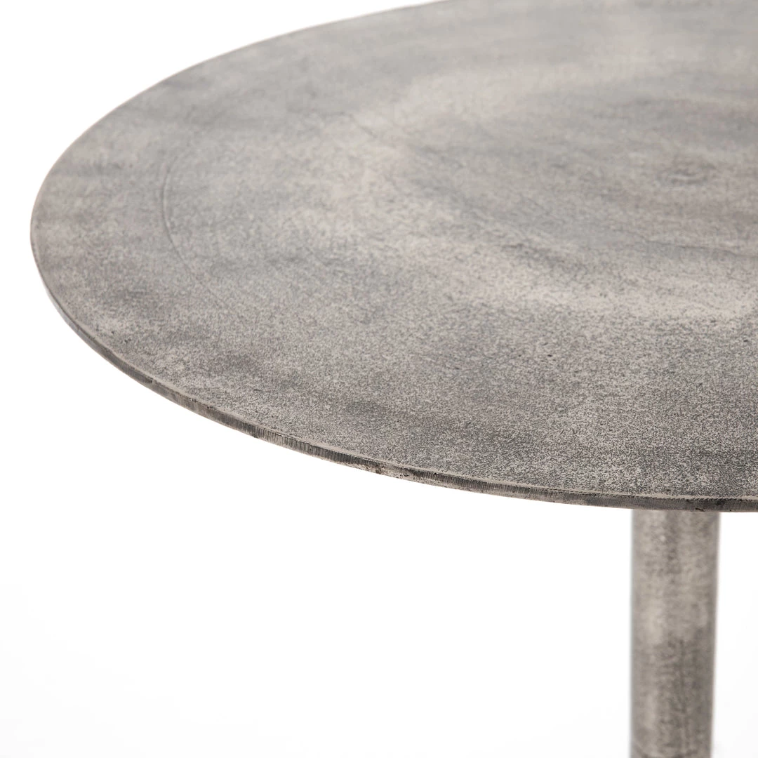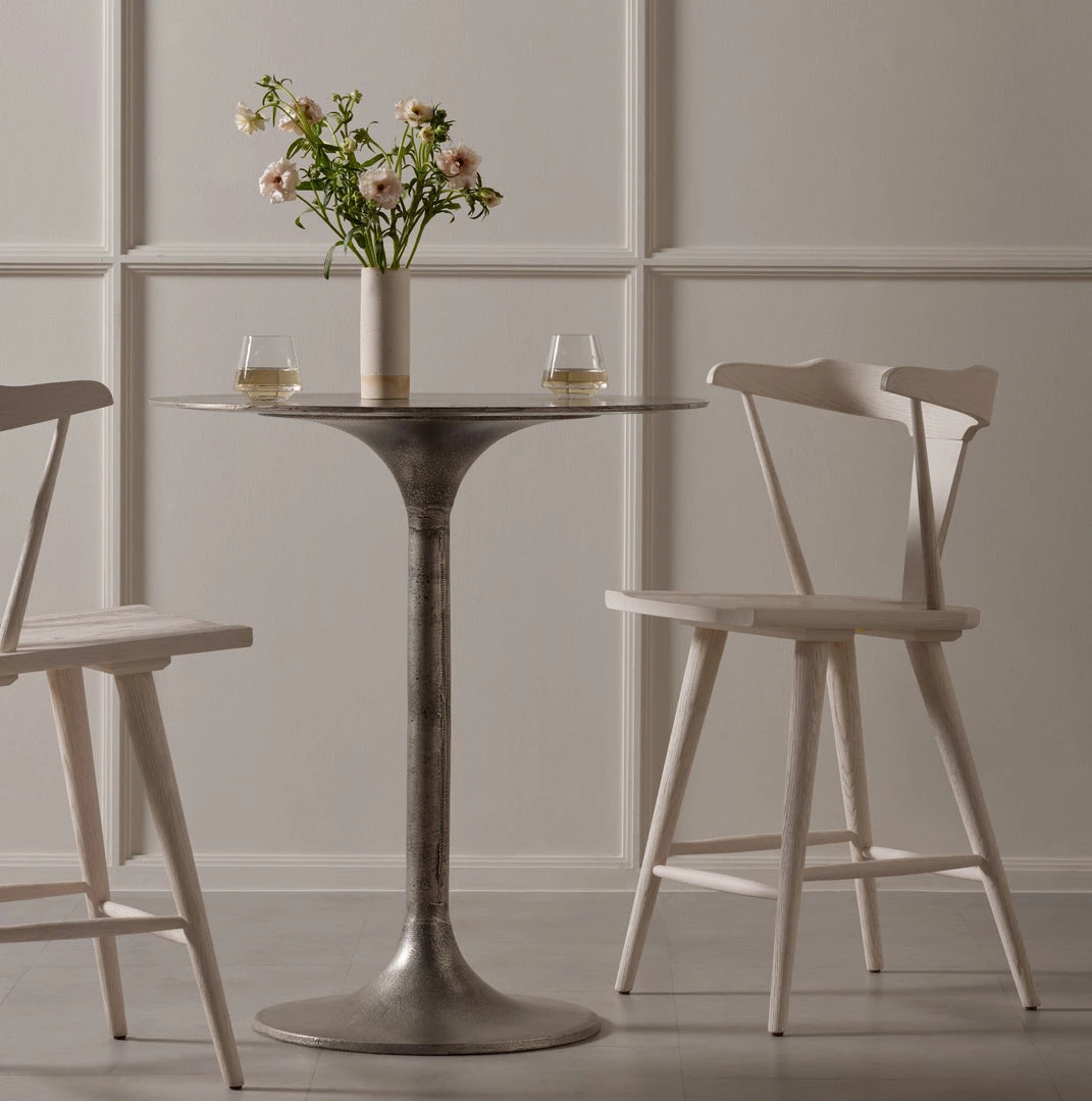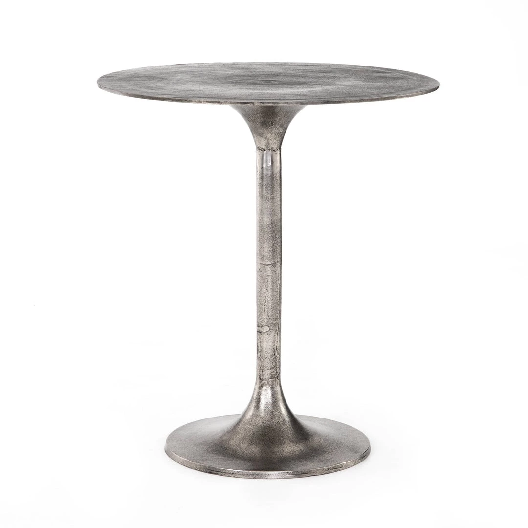 Classic tulip shaping in textural cast-aluminum makes for a modern counter table. Finished in a raw antique nickel to bring out alluring highs and lows, indoors or out. Cover or store inside during inclement weather and when not in use.