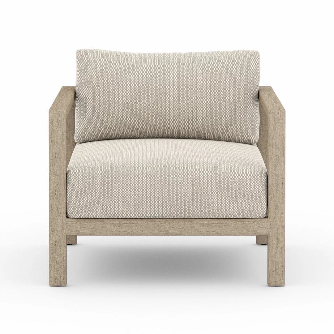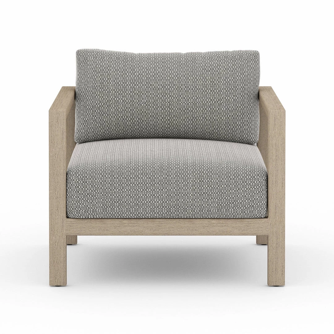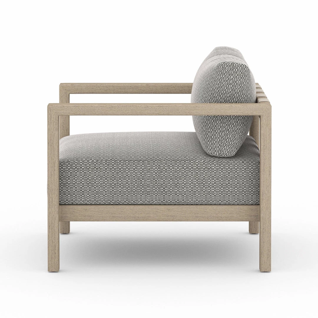 Solid FSC-certified teak forms a clean frame for UV-resistant, water-repellent Sunproof fabric. Neutral back straps add intrigue. Cover or store indoors during inclement weather and when not in use.