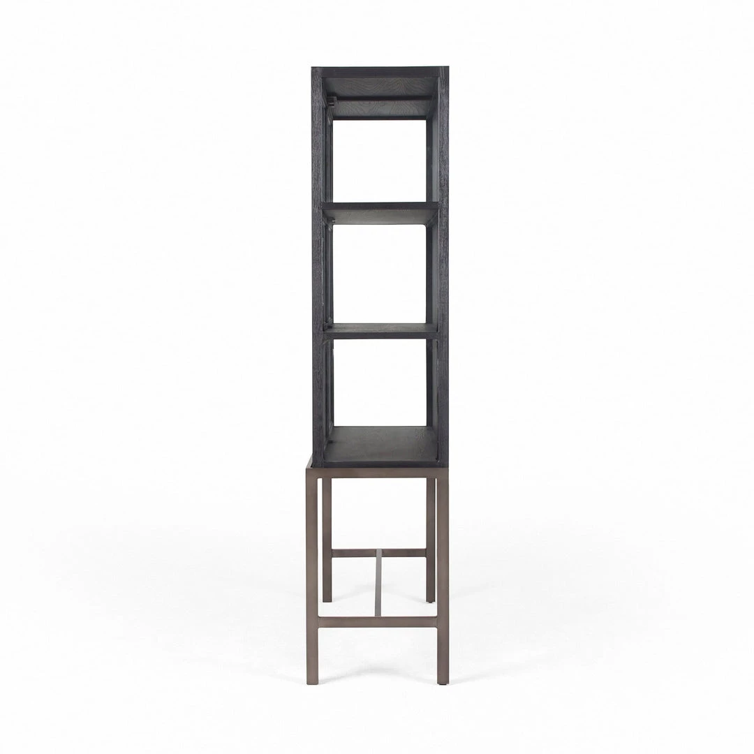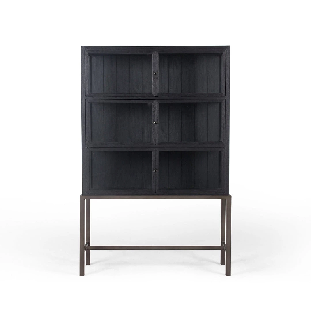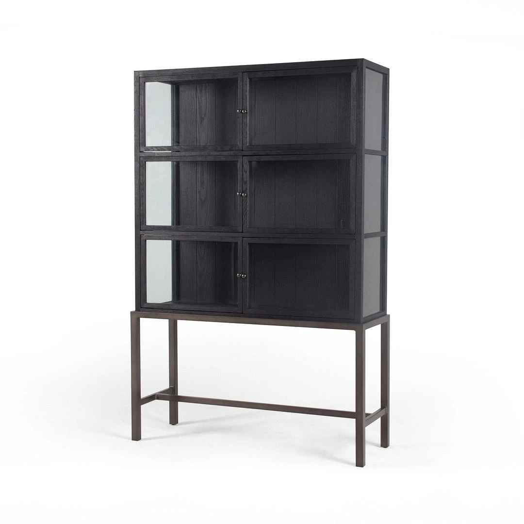 See and be seen. Rustic black-finished oak forms an airy curio cabinet designed to showcase life’s artifacts. Perched on a simple waxed black iron pedestal.