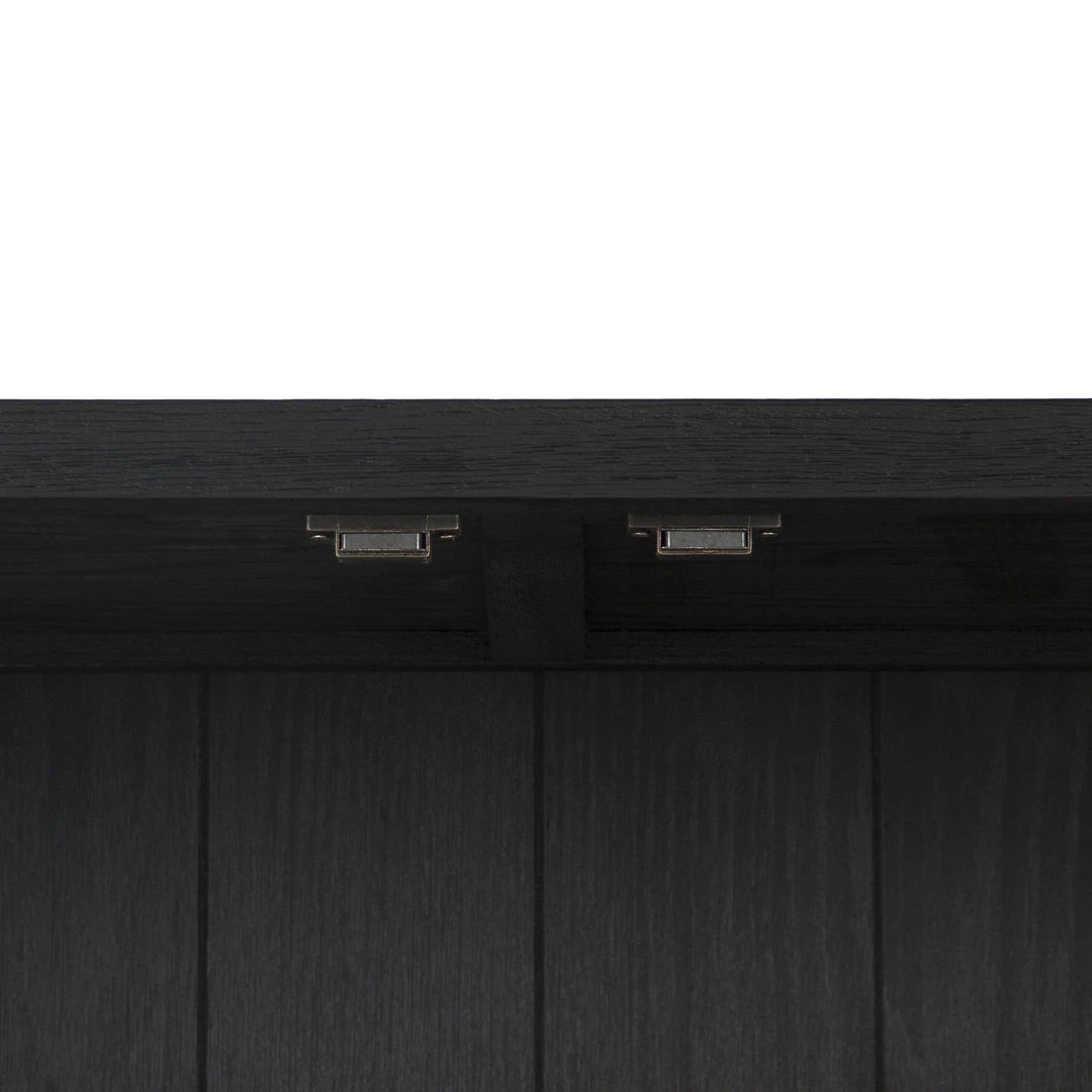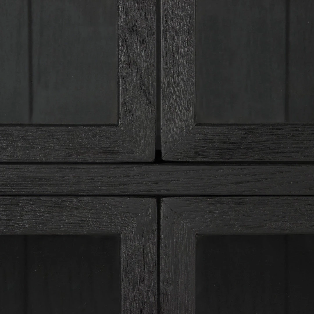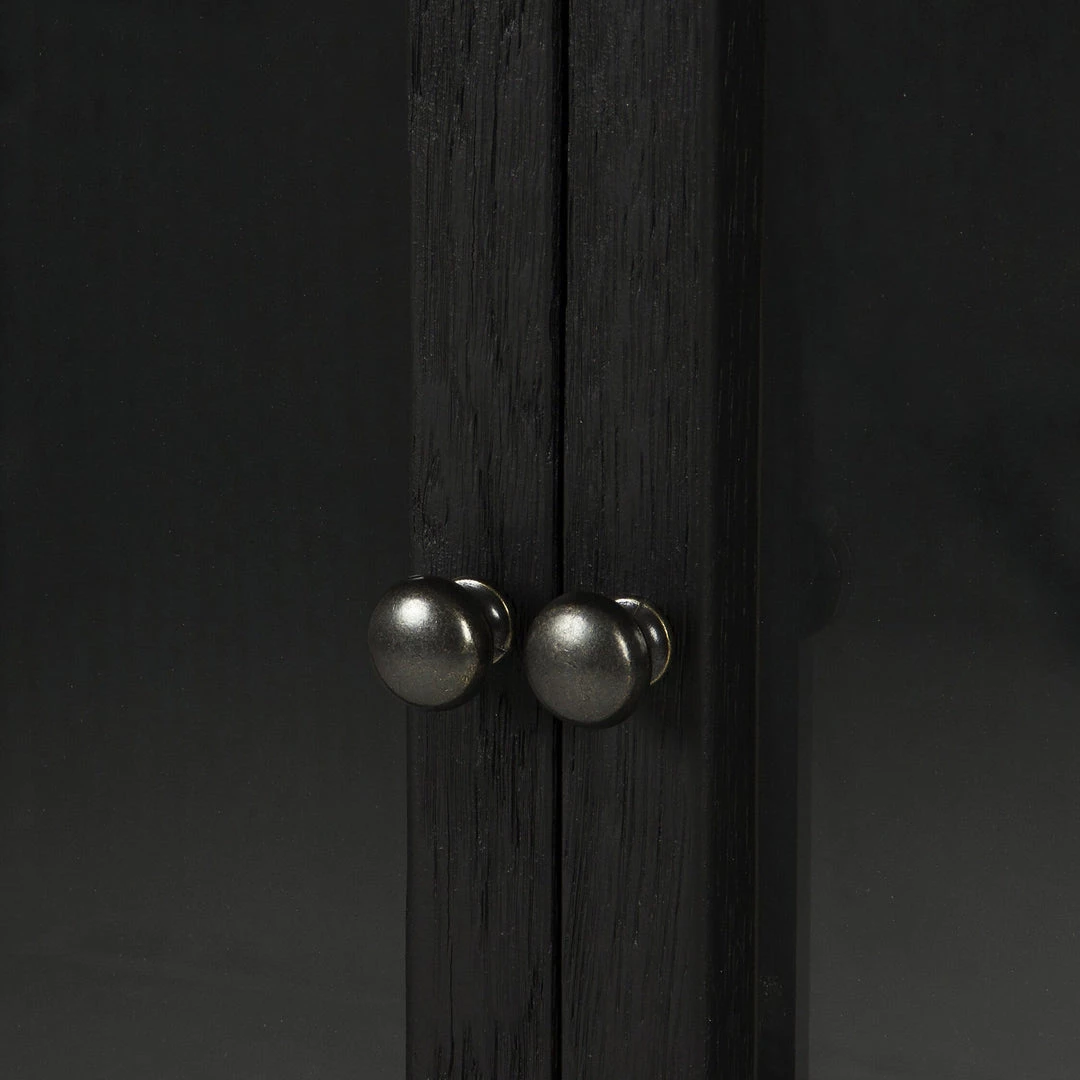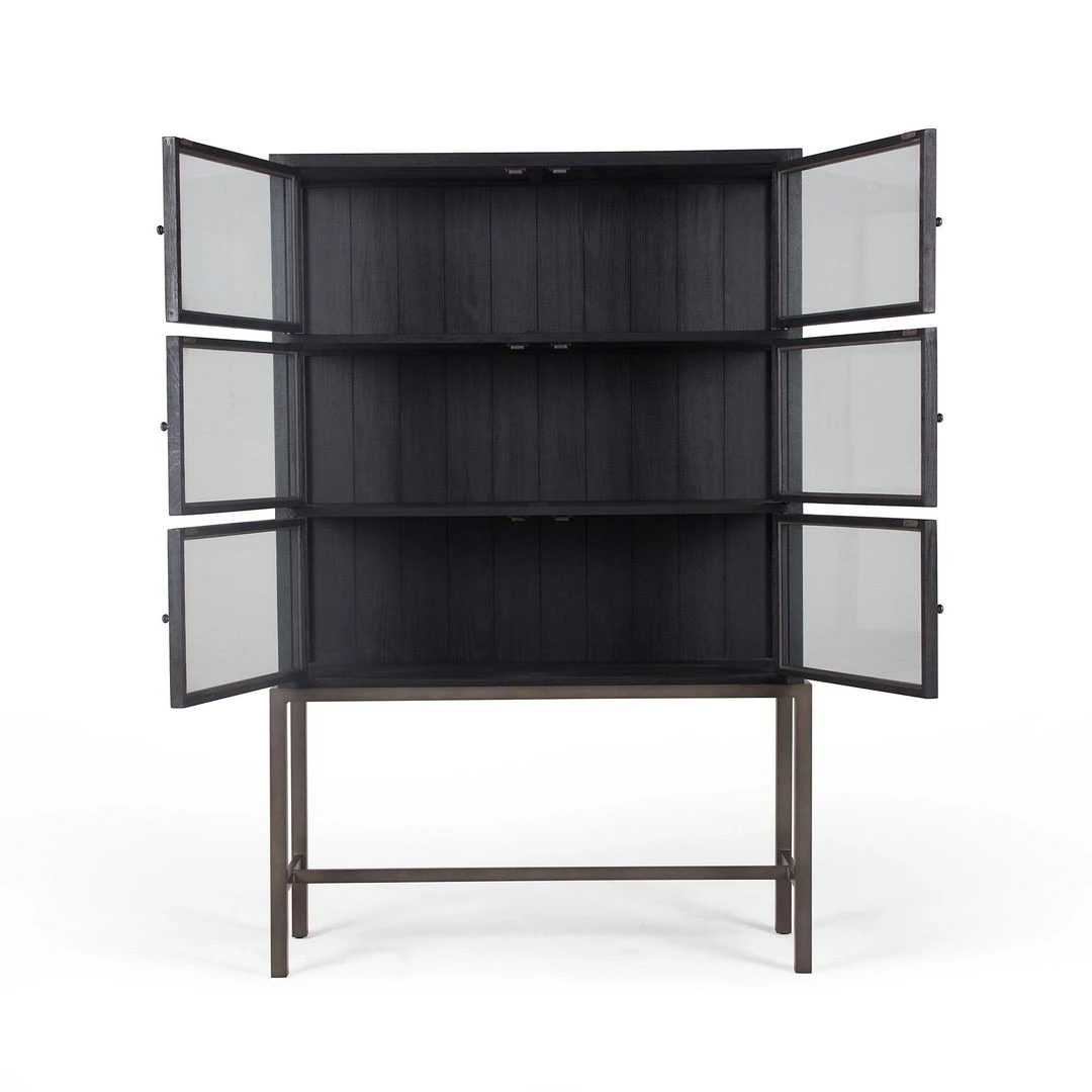 See and be seen. Rustic black-finished oak forms an airy curio cabinet designed to showcase life’s artifacts. Perched on a simple waxed black iron pedestal.