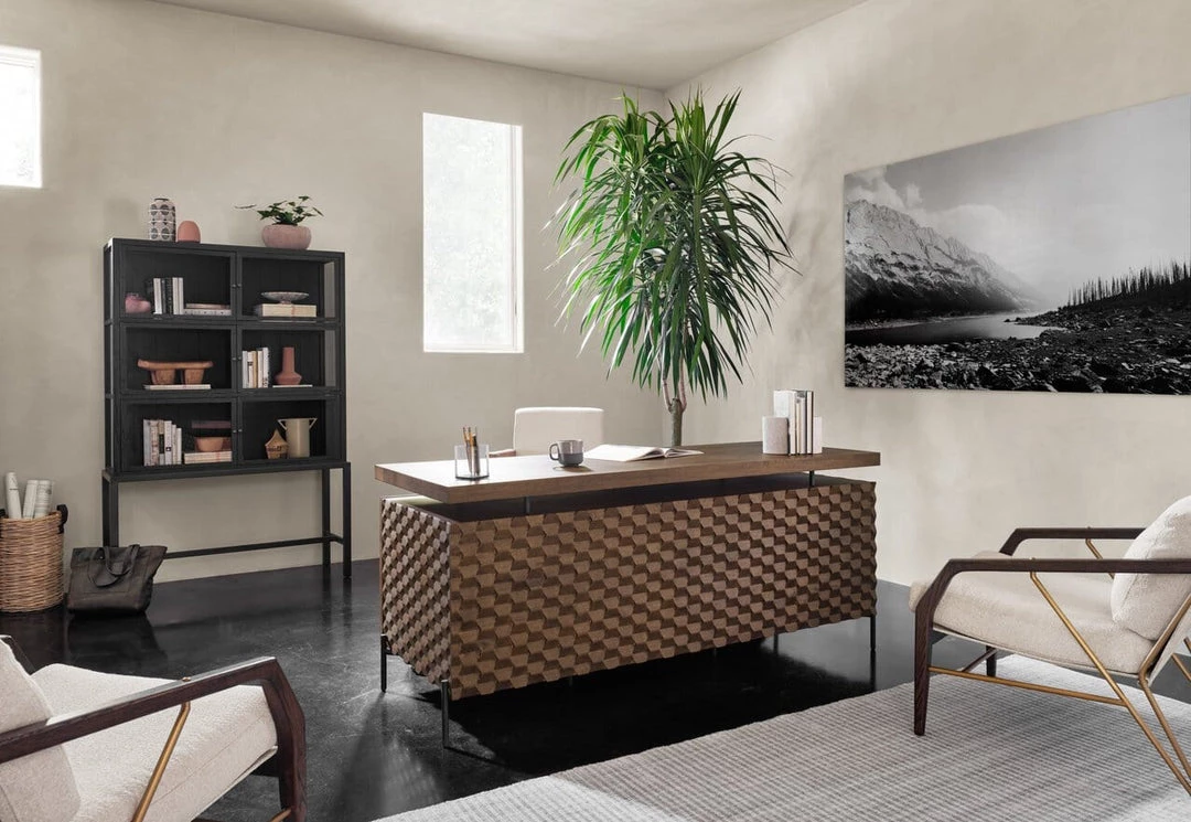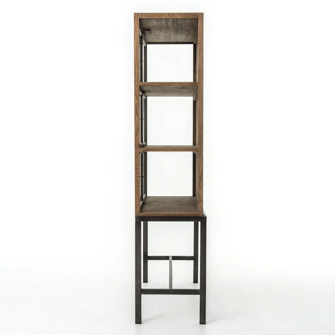 See and be seen. Drifted oak forms an airy curio cabinet designed to highlight life’s artifacts. Perched on a simple, waxed black iron pedestal.