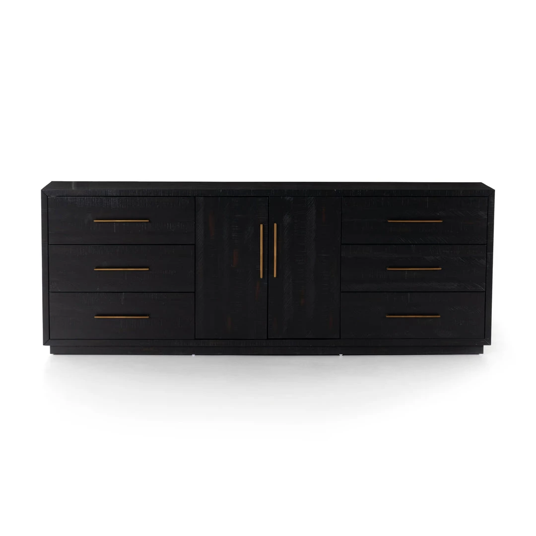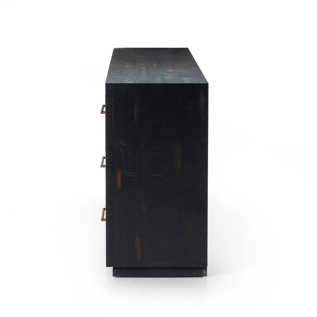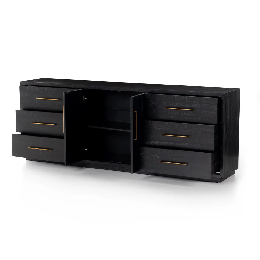 A hand-rubbed, burnished black finish draws the eye with high-low contrasts to modernize a mid-century shape. Brass-finished hardware adds a sleek touch to console’s six spacious drawers and open-front cabinetry.