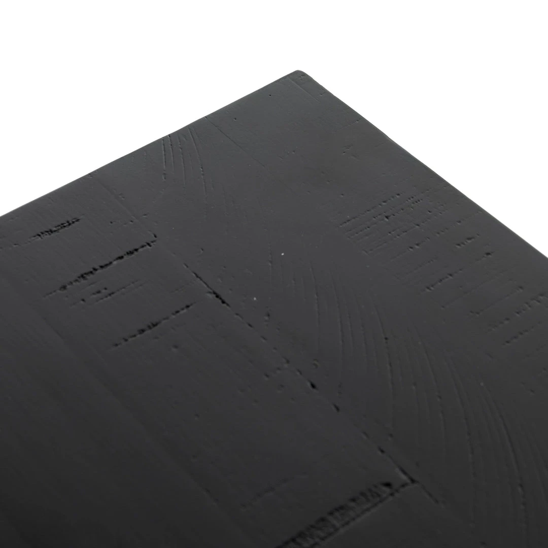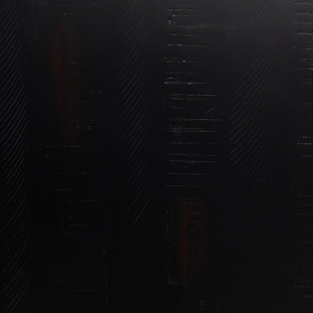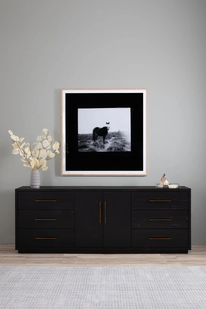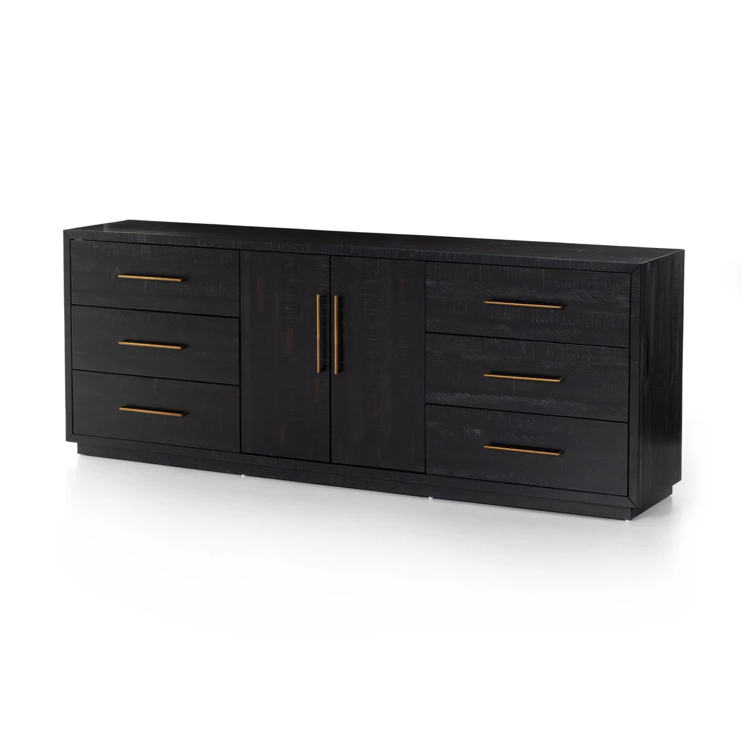 A hand-rubbed, burnished black finish draws the eye with high-low contrasts to modernize a mid-century shape. Brass-finished hardware adds a sleek touch to console’s six spacious drawers and open-front cabinetry.