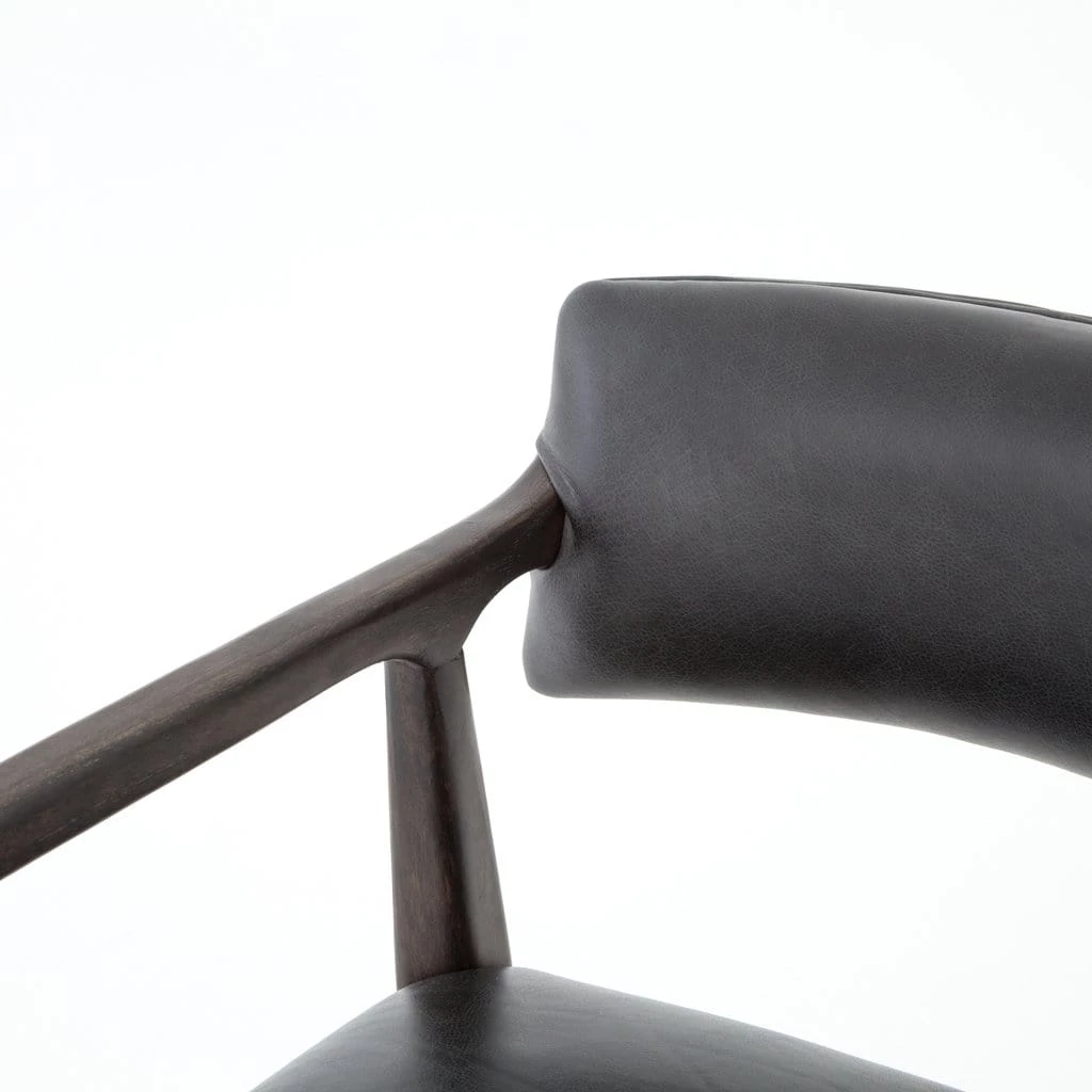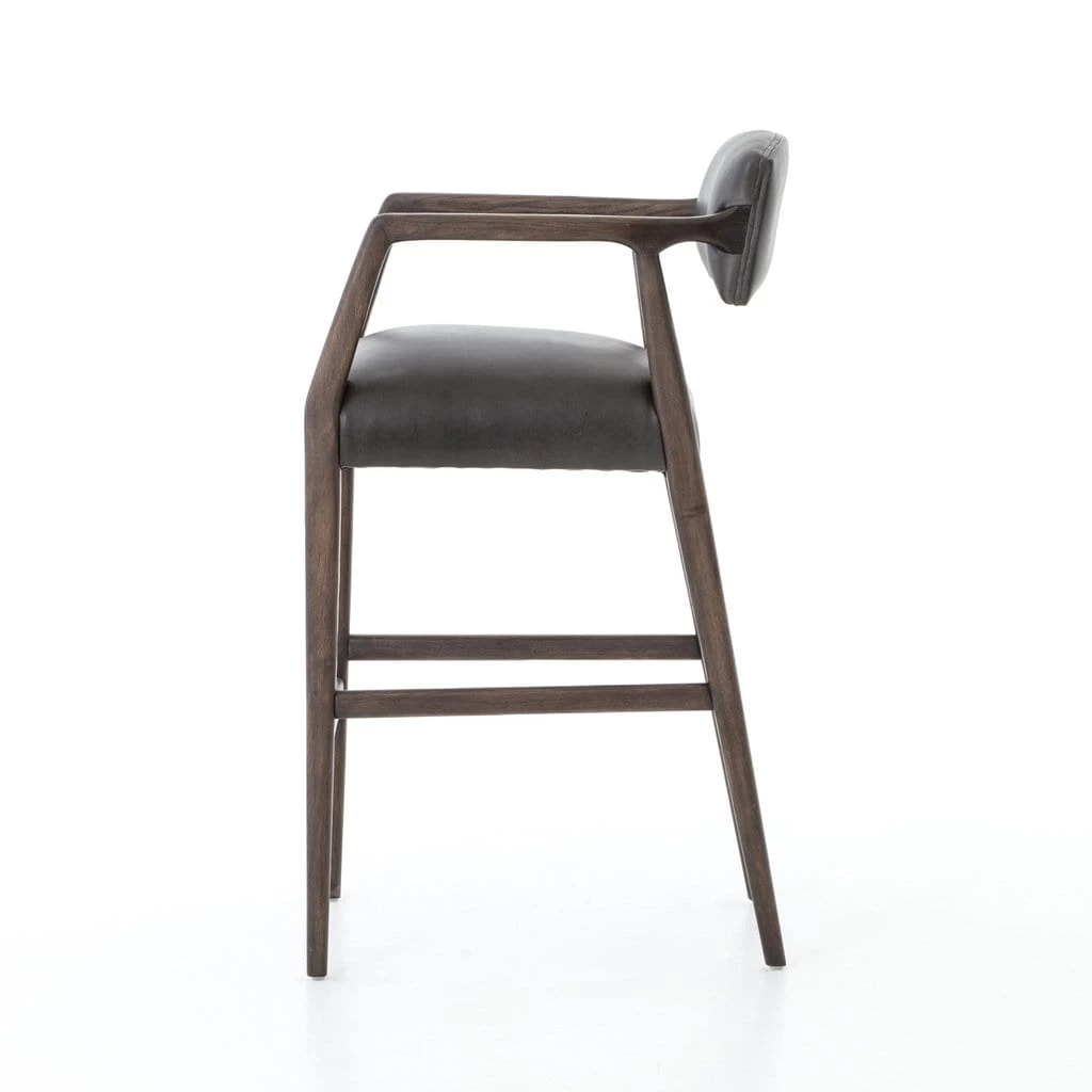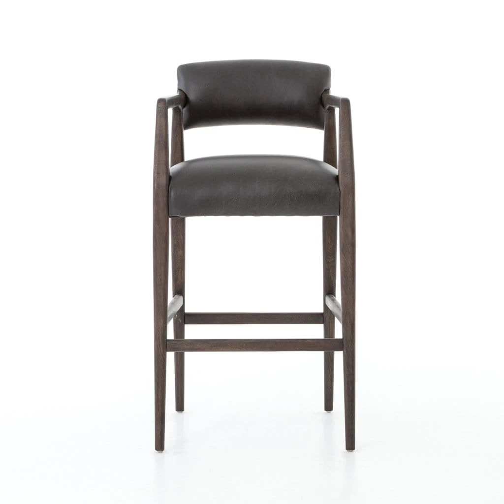 Bar seating is styled with an angular, dark and smoky birch frame, a deep seat, and a striking, low-slung back. Covered in black, top-grain leather.