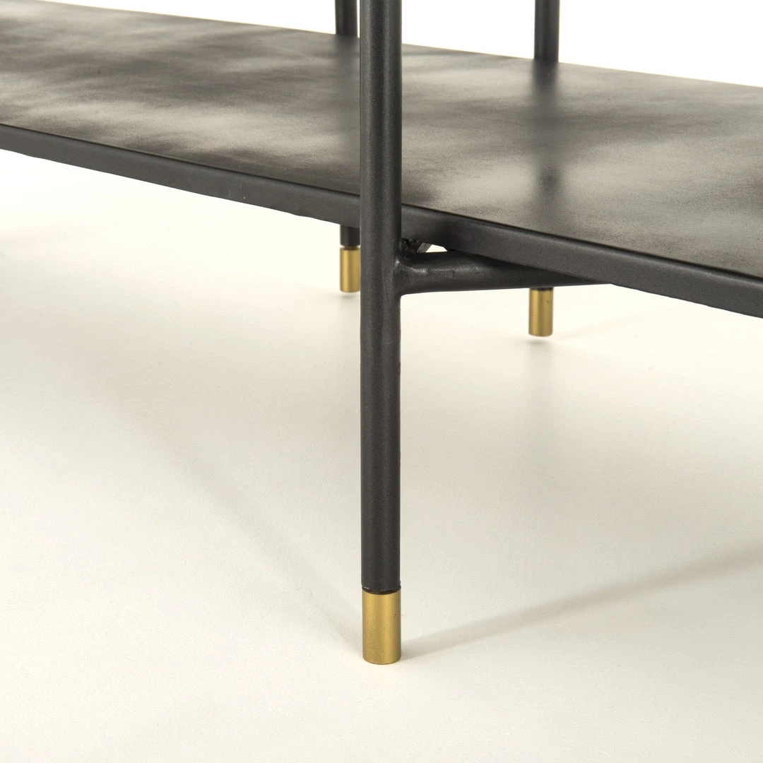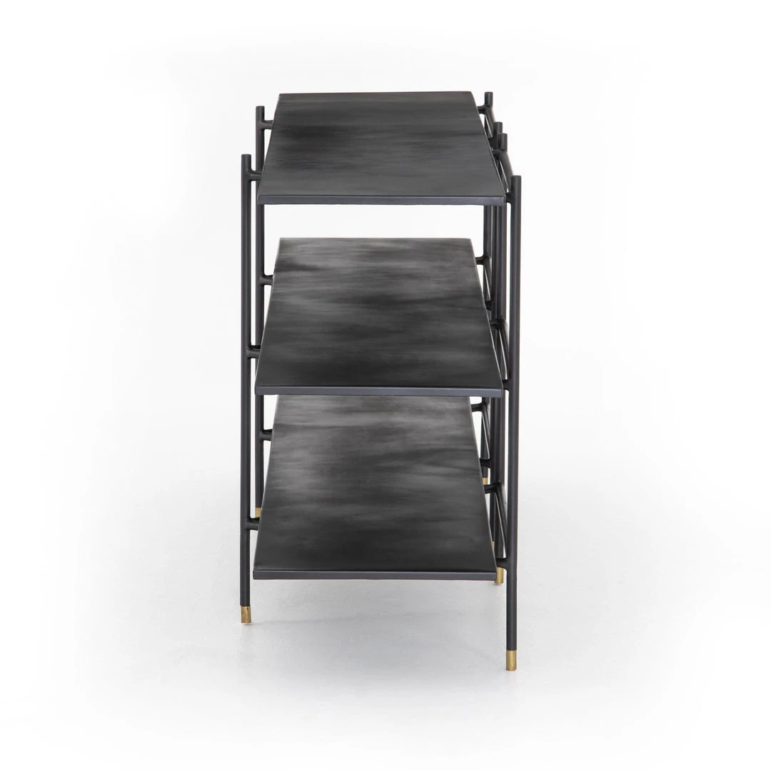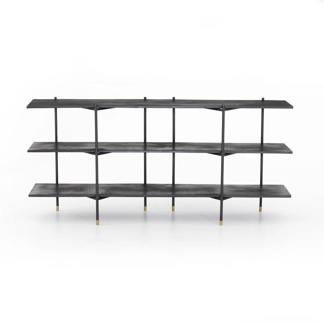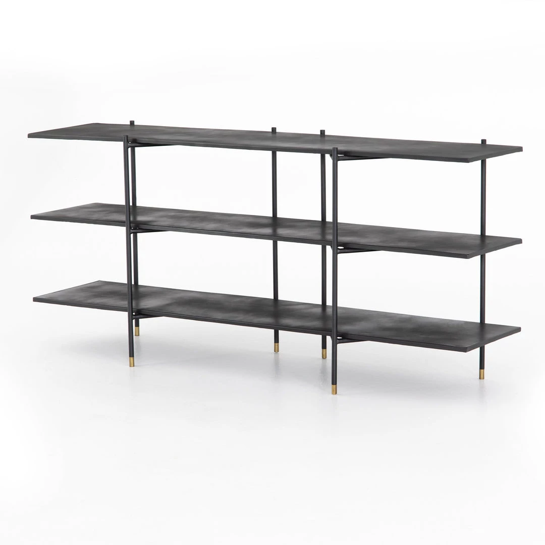 Modern industrial design gets softened by fine lines. Three planks of distressed iron offer plenty of media storage space. Brass-capped feet add a feminine finishing touch.
