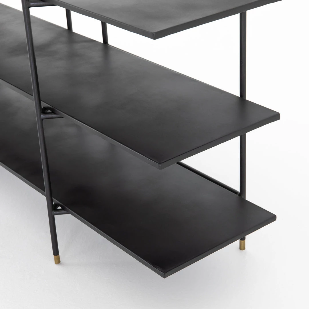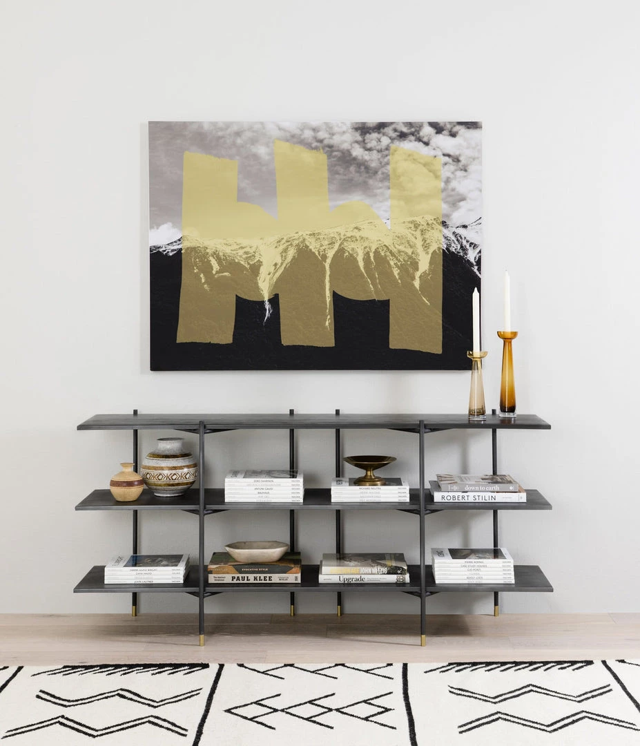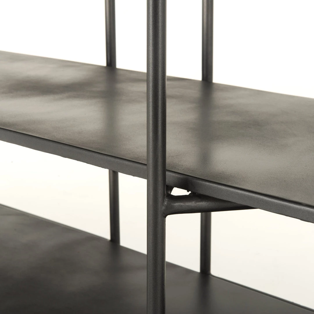Modern industrial design gets softened by fine lines. Three planks of distressed iron offer plenty of media storage space. Brass-capped feet add a feminine finishing touch.