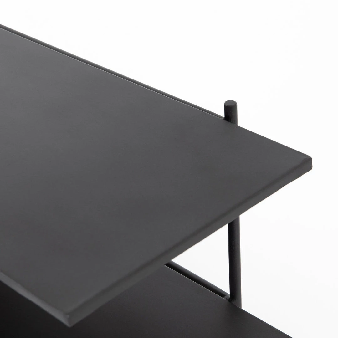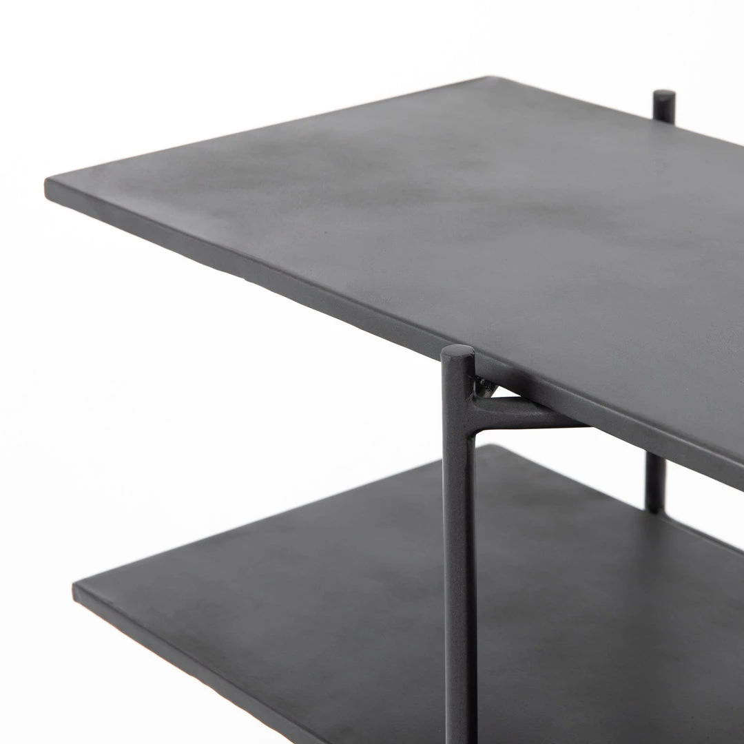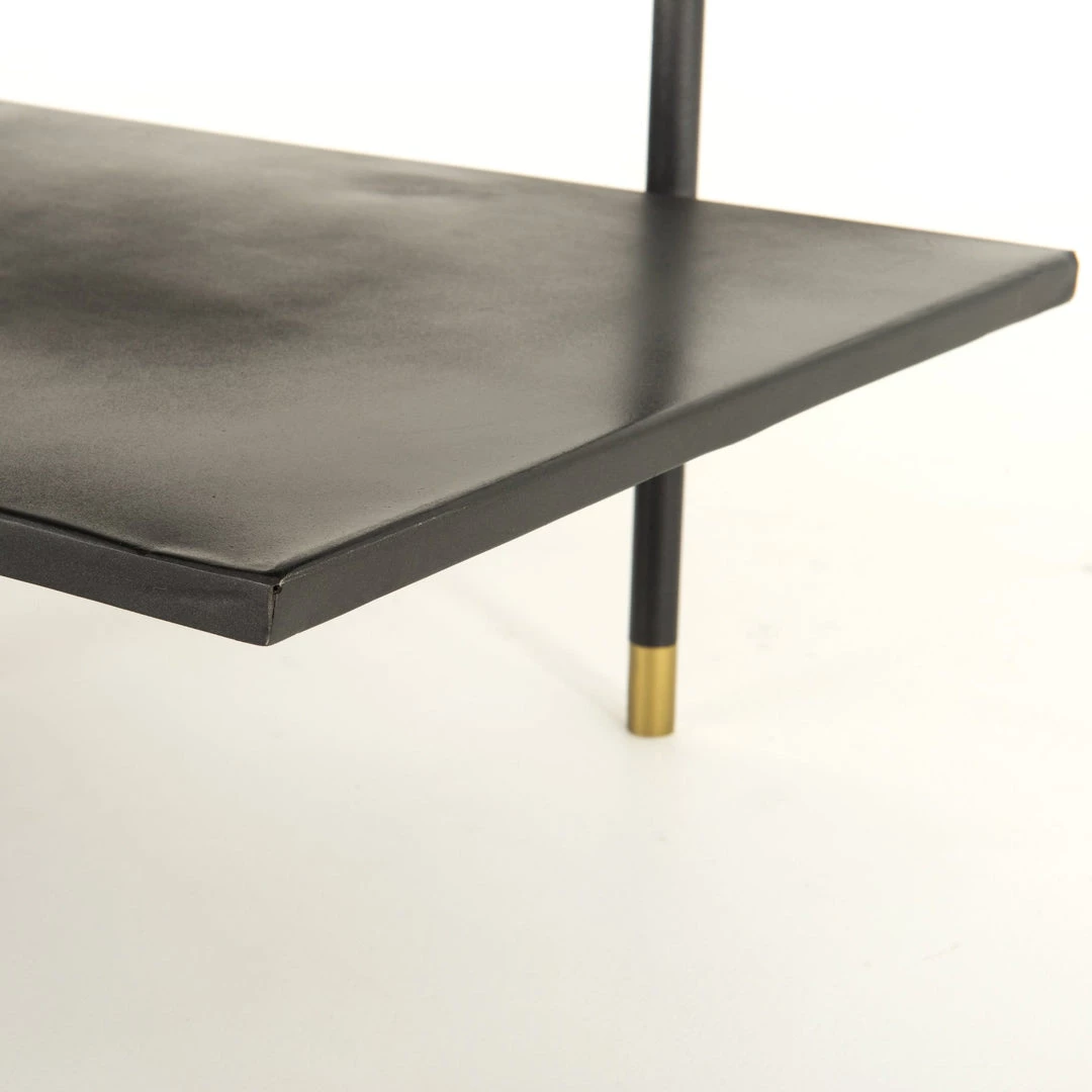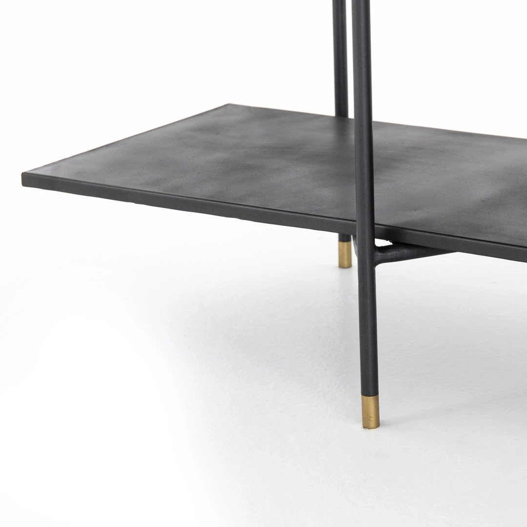 Modern industrial design gets softened by fine lines. Three planks of distressed iron offer plenty of media storage space. Brass-capped feet add a feminine finishing touch.